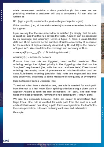 %u062c%u0645%u064a%u0639 %u0627%u0644%u062d%u0642%u0648%u0642 %u0645%u062d%u0641%u0648%u0638%u0629 %u0640 %u0627%u0625%u0644%u0639%u062a%u062f%u0627%u0621 %u0639%u0649%u0644 %u062d%u0642 %u0627%u0645%u0644%u0624%u0644%u0641 %u0628%u0627%u0644%u0646%u0633%u062e %u0623%u0648 %u0627%u0644%u0637%u0628%u0627%u0639%u0629 %u064a%u0639%u0631%u0636 %u0641%u0627%u0639%u0644%u0647 %u0644%u0644%u0645%u0633%u0627%u0626%u0644%u0629 %u0627%u0644%u0642%u0627%u0646%u0648%u0646%u064a%u0629104rule%u2019s consequent contains a class prediction (in this case, we are predicting whether a customer will buy a computer). R1 can also be written as R1: (age = youth) %u2227 (student = yes) %u21d2 (buys computer = yes). If the condition (i.e., all the attribute tests) in a rule antecedent holds true for a given tuple, we say that the rule antecedent is satisfied (or simply, that the rule is satisfied) and that the rule covers the tuple. A rule R can be assessed by its coverage and accuracy. Given a tuple, X, from a class-labeled data set, D, let ncovers be the number of tuples covered by R; n correct be the number of tuples correctly classified by R; and |D| be the number of tuples in D. We can define the coverage and accuracy of R as coverage(R) = ncovers /|D| /* D: training data set */ accuracy(R) = ncorrect / ncovers If more than one rule are triggered, need conflict resolution. Size ordering: assign the highest priority to the triggering rules that has the %u201ctoughest%u201d requirement (i.e., with the most attribute tests).Class-based ordering: decreasing order of prevalence or misclassification cost per class.Rule-based ordering (decision list): rules are organized into one long priority list, according to some measure of rule quality or by experts. Rule Extraction from a Decision Tree: To extract rules from a decision tree, one rule is created for each path from the root to a leaf node. Each splitting criterion along a given path is logically ANDed to form the rule antecedent (%u201cIF%u201d part). The leaf node holds the class prediction, forming the rule consequent (%u201cTHEN%u201d part). We use this approach because: Rules are easier to understand than large trees, One rule is created for each path from the root to a leaf, each attribute-value pair along a path forms a conjunction: the leaf holds the class prediction ,rules are mutually exclusive and exhaustive. Example: