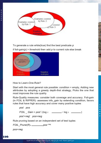 %u062c%u0645%u064a%u0639 %u0627%u0644%u062d%u0642%u0648%u0642 %u0645%u062d%u0641%u0648%u0638%u0629 %u0640 %u0627%u0625%u0644%u0639%u062a%u062f%u0627%u0621 %u0639%u0649%u0644 %u062d%u0642 %u0627%u0645%u0644%u0624%u0644%u0641 %u0628%u0627%u0644%u0646%u0633%u062e %u0623%u0648 %u0627%u0644%u0637%u0628%u0627%u0639%u0629 %u064a%u0639%u0631%u0636 %u0641%u0627%u0639%u0644%u0647 %u0644%u0644%u0645%u0633%u0627%u0626%u0644%u0629 %u0627%u0644%u0642%u0627%u0646%u0648%u0646%u064a%u0629106To generate a rule while(true) find the best predicate pif foil-gain(p) > threshold then add p to current rule else break How to Learn-One-Rule? Start with the most general rule possible: condition = empty, Adding new attributes by adopting a greedy depth-first strategy, Picks the one that most improves the rule quality Rule-Quality measures: consider both coverage and accuracy. Foil-gain (in FOIL & RIPPER): assesses info_gain by extending condition, favors rules that have high accuracy and cover many positive tuples pos' posFOIL _ Gain = pos' (log 2 %u2212 log 2 )pos'+neg' pos+negRule pruning based on an independent set of test tuples FOIL_Prune(R)= pos%u2212negpos+neg