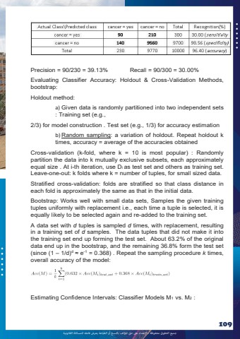 %u062c%u0645%u064a%u0639 %u0627%u0644%u062d%u0642%u0648%u0642 %u0645%u062d%u0641%u0648%u0638%u0629 %u0640 %u0627%u0625%u0644%u0639%u062a%u062f%u0627%u0621 %u0639%u0649%u0644 %u062d%u0642 %u0627%u0645%u0644%u0624%u0644%u0641 %u0628%u0627%u0644%u0646%u0633%u062e %u0623%u0648 %u0627%u0644%u0637%u0628%u0627%u0639%u0629 %u064a%u0639%u0631%u0636 %u0641%u0627%u0639%u0644%u0647 %u0644%u0644%u0645%u0633%u0627%u0626%u0644%u0629 %u0627%u0644%u0642%u0627%u0646%u0648%u0646%u064a%u0629109Precision = 90/230 = 39.13% Recall = 90/300 = 30.00% Evaluating Classifier Accuracy: Holdout & Cross-Validation Methods, bootstrap: Holdout method: a) Given data is randomly partitioned into two independent sets : Training set (e.g., 2/3) for model construction . Test set (e.g., 1/3) for accuracy estimation b) Random sampling: a variation of holdout. Repeat holdout k times, accuracy = average of the accuracies obtained Cross-validation (k-fold, where k = 10 is most popular) : Randomly partition the data into k mutually exclusive subsets, each approximately equal size . At i-th iteration, use Di as test set and others as training set. Leave-one-out: k folds where k = number of tuples, for small sized data. Stratified cross-validation: folds are stratified so that class distance in each fold is approximately the same as that in the initial data. Bootstrap: Works well with small data sets, Samples the given training tuples uniformly with replacement i.e., each time a tuple is selected, it is equally likely to be selected again and re-added to the training set. A data set with d tuples is sampled d times, with replacement, resulting in a training set of d samples. The data tuples that did not make it into the training set end up forming the test set. About 63.2% of the original data end up in the bootstrap, and the remaining 36.8% form the test set (since (1 %u2013 1/d)d %u2248 e-1 = 0.368) . Repeat the sampling procedure k times, overall accuracy of the model: Estimating Confidence Intervals: Classifier Models M1 vs. M2 :
