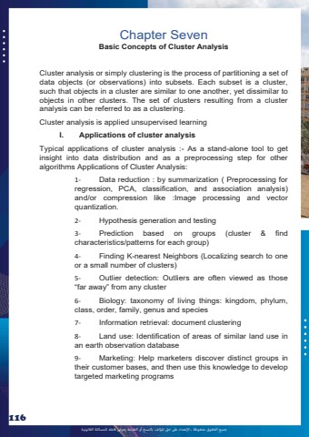 %u062c%u0645%u064a%u0639 %u0627%u0644%u062d%u0642%u0648%u0642 %u0645%u062d%u0641%u0648%u0638%u0629 %u0640 %u0627%u0625%u0644%u0639%u062a%u062f%u0627%u0621 %u0639%u0649%u0644 %u062d%u0642 %u0627%u0645%u0644%u0624%u0644%u0641 %u0628%u0627%u0644%u0646%u0633%u062e %u0623%u0648 %u0627%u0644%u0637%u0628%u0627%u0639%u0629 %u064a%u0639%u0631%u0636 %u0641%u0627%u0639%u0644%u0647 %u0644%u0644%u0645%u0633%u0627%u0626%u0644%u0629 %u0627%u0644%u0642%u0627%u0646%u0648%u0646%u064a%u0629116Chapter SevenBasic Concepts of Cluster AnalysisCluster analysis or simply clustering is the process of partitioning a set of data objects (or observations) into subsets. Each subset is a cluster, such that objects in a cluster are similar to one another, yet dissimilar to objects in other clusters. The set of clusters resulting from a cluster analysis can be referred to as a clustering. Cluster analysis is applied unsupervised learning I. Applications of cluster analysis Typical applications of cluster analysis :- As a stand-alone tool to get insight into data distribution and as a preprocessing step for other algorithms Applications of Cluster Analysis: 1- Data reduction : by summarization ( Preprocessing for regression, PCA, classification, and association analysis) and/or compression like :Image processing and vector quantization. 2- Hypothesis generation and testing 3- Prediction based on groups (cluster & find characteristics/patterns for each group) 4- Finding K-nearest Neighbors (Localizing search to one or a small number of clusters) 5- Outlier detection: Outliers are often viewed as those %u201cfar away%u201d from any cluster 6- Biology: taxonomy of living things: kingdom, phylum, class, order, family, genus and species 7- Information retrieval: document clustering 8- Land use: Identification of areas of similar land use in an earth observation database 9- Marketing: Help marketers discover distinct groups in their customer bases, and then use this knowledge to develop targeted marketing programs
