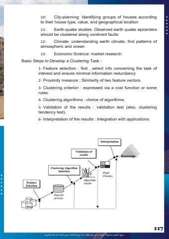 %u062c%u0645%u064a%u0639 %u0627%u0644%u062d%u0642%u0648%u0642 %u0645%u062d%u0641%u0648%u0638%u0629 %u0640 %u0627%u0625%u0644%u0639%u062a%u062f%u0627%u0621 %u0639%u0649%u0644 %u062d%u0642 %u0627%u0645%u0644%u0624%u0644%u0641 %u0628%u0627%u0644%u0646%u0633%u062e %u0623%u0648 %u0627%u0644%u0637%u0628%u0627%u0639%u0629 %u064a%u0639%u0631%u0636 %u0641%u0627%u0639%u0644%u0647 %u0644%u0644%u0645%u0633%u0627%u0626%u0644%u0629 %u0627%u0644%u0642%u0627%u0646%u0648%u0646%u064a%u062911710- City-planning: Identifying groups of houses according to their house type, value, and geographical location 11- Earth-quake studies: Observed earth quake epicenters should be clustered along continent faults 12- Climate: understanding earth climate, find patterns of atmospheric and ocean 13- Economic Science: market research Basic Steps to Develop a Clustering Task : 1- Feature selection : first , select info concerning the task of interest and ensure minimal information redundancy 2- Proximity measure : Similarity of two feature vectors. 3- Clustering criterion : expressed via a cost function or some rules. 4- Clustering algorithms : choice of algorithms. 5- Validation of the results : validation test (also, clustering tendency test). 6- Interpretation of the results : Integration with applications.