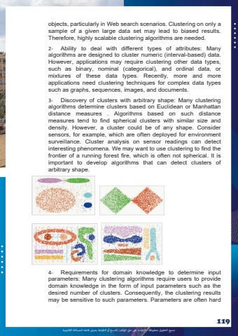 %u062c%u0645%u064a%u0639 %u0627%u0644%u062d%u0642%u0648%u0642 %u0645%u062d%u0641%u0648%u0638%u0629 %u0640 %u0627%u0625%u0644%u0639%u062a%u062f%u0627%u0621 %u0639%u0649%u0644 %u062d%u0642 %u0627%u0645%u0644%u0624%u0644%u0641 %u0628%u0627%u0644%u0646%u0633%u062e %u0623%u0648 %u0627%u0644%u0637%u0628%u0627%u0639%u0629 %u064a%u0639%u0631%u0636 %u0641%u0627%u0639%u0644%u0647 %u0644%u0644%u0645%u0633%u0627%u0626%u0644%u0629 %u0627%u0644%u0642%u0627%u0646%u0648%u0646%u064a%u0629119objects, particularly in Web search scenarios. Clustering on only a sample of a given large data set may lead to biased results. Therefore, highly scalable clustering algorithms are needed. 2- Ability to deal with different types of attributes: Many algorithms are designed to cluster numeric (interval-based) data. However, applications may require clustering other data types, such as binary, nominal (categorical), and ordinal data, or mixtures of these data types. Recently, more and more applications need clustering techniques for complex data types such as graphs, sequences, images, and documents. 3- Discovery of clusters with arbitrary shape: Many clustering algorithms determine clusters based on Euclidean or Manhattan distance measures . Algorithms based on such distance measures tend to find spherical clusters with similar size and density. However, a cluster could be of any shape. Consider sensors, for example, which are often deployed for environment surveillance. Cluster analysis on sensor readings can detect interesting phenomena. We may want to use clustering to find the frontier of a running forest fire, which is often not spherical. It is important to develop algorithms that can detect clusters of arbitrary shape. 4- Requirements for domain knowledge to determine input parameters: Many clustering algorithms require users to provide domain knowledge in the form of input parameters such as the desired number of clusters. Consequently, the clustering results may be sensitive to such parameters. Parameters are often hard