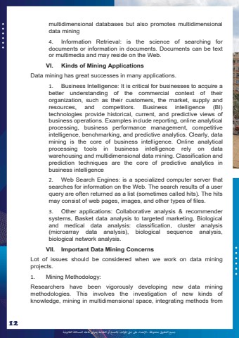 %u062c%u0645%u064a%u0639 %u0627%u0644%u062d%u0642%u0648%u0642 %u0645%u062d%u0641%u0648%u0638%u0629 %u0640 %u0627%u0625%u0644%u0639%u062a%u062f%u0627%u0621 %u0639%u0649%u0644 %u062d%u0642 %u0627%u0645%u0644%u0624%u0644%u0641 %u0628%u0627%u0644%u0646%u0633%u062e %u0623%u0648 %u0627%u0644%u0637%u0628%u0627%u0639%u0629 %u064a%u0639%u0631%u0636 %u0641%u0627%u0639%u0644%u0647 %u0644%u0644%u0645%u0633%u0627%u0626%u0644%u0629 %u0627%u0644%u0642%u0627%u0646%u0648%u0646%u064a%u062912multidimensional databases but also promotes multidimensional data mining 4. Information Retrieval: is the science of searching for documents or information in documents. Documents can be text or multimedia and may reside on the Web. VI. Kinds of Mining Applications Data mining has great successes in many applications. 1. Business Intelligence: It is critical for businesses to acquire a better understanding of the commercial context of their organization, such as their customers, the market, supply and resources, and competitors. Business intelligence (BI) technologies provide historical, current, and predictive views of business operations. Examples include reporting, online analytical processing, business performance management, competitive intelligence, benchmarking, and predictive analytics. Clearly, data mining is the core of business intelligence. Online analytical processing tools in business intelligence rely on data warehousing and multidimensional data mining. Classification and prediction techniques are the core of predictive analytics in business intelligence 2. Web Search Engines: is a specialized computer server that searches for information on the Web. The search results of a user query are often returned as a list (sometimes called hits). The hits may consist of web pages, images, and other types of files. 3. Other applications: Collaborative analysis & recommender systems, Basket data analysis to targeted marketing, Biological and medical data analysis: classification, cluster analysis (microarray data analysis), biological sequence analysis, biological network analysis. VII. Important Data Mining Concerns Lot of issues should be considered when we work on data mining projects. 1. Mining Methodology: Researchers have been vigorously developing new data mining methodologies. This involves the investigation of new kinds of knowledge, mining in multidimensional space, integrating methods from