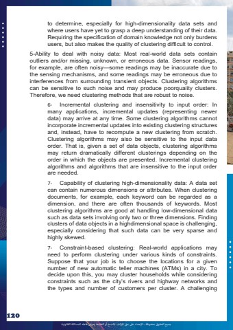%u062c%u0645%u064a%u0639 %u0627%u0644%u062d%u0642%u0648%u0642 %u0645%u062d%u0641%u0648%u0638%u0629 %u0640 %u0627%u0625%u0644%u0639%u062a%u062f%u0627%u0621 %u0639%u0649%u0644 %u062d%u0642 %u0627%u0645%u0644%u0624%u0644%u0641 %u0628%u0627%u0644%u0646%u0633%u062e %u0623%u0648 %u0627%u0644%u0637%u0628%u0627%u0639%u0629 %u064a%u0639%u0631%u0636 %u0641%u0627%u0639%u0644%u0647 %u0644%u0644%u0645%u0633%u0627%u0626%u0644%u0629 %u0627%u0644%u0642%u0627%u0646%u0648%u0646%u064a%u0629120to determine, especially for high-dimensionality data sets and where users have yet to grasp a deep understanding of their data. Requiring the specification of domain knowledge not only burdens users, but also makes the quality of clustering difficult to control. 5-Ability to deal with noisy data: Most real-world data sets contain outliers and/or missing, unknown, or erroneous data. Sensor readings, for example, are often noisy%u2014some readings may be inaccurate due to the sensing mechanisms, and some readings may be erroneous due to interferences from surrounding transient objects. Clustering algorithms can be sensitive to such noise and may produce poorquality clusters. Therefore, we need clustering methods that are robust to noise. 6- Incremental clustering and insensitivity to input order: In many applications, incremental updates (representing newer data) may arrive at any time. Some clustering algorithms cannot incorporate incremental updates into existing clustering structures and, instead, have to recompute a new clustering from scratch. Clustering algorithms may also be sensitive to the input data order. That is, given a set of data objects, clustering algorithms may return dramatically different clusterings depending on the order in which the objects are presented. Incremental clustering algorithms and algorithms that are insensitive to the input order are needed. 7- Capability of clustering high-dimensionality data: A data set can contain numerous dimensions or attributes. When clustering documents, for example, each keyword can be regarded as a dimension, and there are often thousands of keywords. Most clustering algorithms are good at handling low-dimensional data such as data sets involving only two or three dimensions. Finding clusters of data objects in a highdimensional space is challenging, especially considering that such data can be very sparse and highly skewed. 7- Constraint-based clustering: Real-world applications may need to perform clustering under various kinds of constraints. Suppose that your job is to choose the locations for a given number of new automatic teller machines (ATMs) in a city. To decide upon this, you may cluster households while considering constraints such as the city%u2019s rivers and highway networks and the types and number of customers per cluster. A challenging