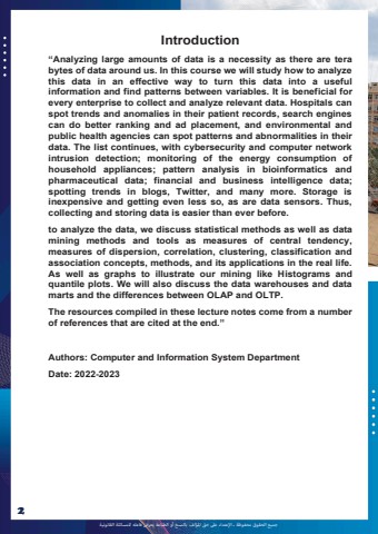 %u062c%u0645%u064a%u0639 %u0627%u0644%u062d%u0642%u0648%u0642 %u0645%u062d%u0641%u0648%u0638%u0629 %u0640 %u0627%u0625%u0644%u0639%u062a%u062f%u0627%u0621 %u0639%u0649%u0644 %u062d%u0642 %u0627%u0645%u0644%u0624%u0644%u0641 %u0628%u0627%u0644%u0646%u0633%u062e %u0623%u0648 %u0627%u0644%u0637%u0628%u0627%u0639%u0629 %u064a%u0639%u0631%u0636 %u0641%u0627%u0639%u0644%u0647 %u0644%u0644%u0645%u0633%u0627%u0626%u0644%u0629 %u0627%u0644%u0642%u0627%u0646%u0648%u0646%u064a%u06292Introduction%u201cAnalyzing large amounts of data is a necessity as there are tera bytes of data around us. In this course we will study how to analyze this data in an effective way to turn this data into a useful information and find patterns between variables. It is beneficial for every enterprise to collect and analyze relevant data. Hospitals can spot trends and anomalies in their patient records, search engines can do better ranking and ad placement, and environmental and public health agencies can spot patterns and abnormalities in their data. The list continues, with cybersecurity and computer network intrusion detection; monitoring of the energy consumption of household appliances; pattern analysis in bioinformatics and pharmaceutical data; financial and business intelligence data; spotting trends in blogs, Twitter, and many more. Storage is inexpensive and getting even less so, as are data sensors. Thus, collecting and storing data is easier than ever before. to analyze the data, we discuss statistical methods as well as data mining methods and tools as measures of central tendency, measures of dispersion, correlation, clustering, classification and association concepts, methods, and its applications in the real life. As well as graphs to illustrate our mining like Histograms and quantile plots. We will also discuss the data warehouses and data marts and the differences between OLAP and OLTP. The resources compiled in these lecture notes come from a number of references that are cited at the end.%u201dAuthors: Computer and Information System DepartmentDate: 2022-2023