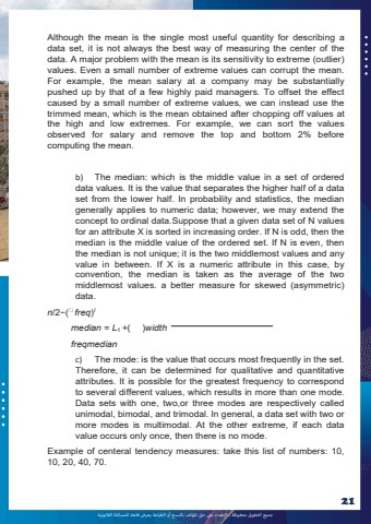 %u062c%u0645%u064a%u0639 %u0627%u0644%u062d%u0642%u0648%u0642 %u0645%u062d%u0641%u0648%u0638%u0629 %u0640 %u0627%u0625%u0644%u0639%u062a%u062f%u0627%u0621 %u0639%u0649%u0644 %u062d%u0642 %u0627%u0645%u0644%u0624%u0644%u0641 %u0628%u0627%u0644%u0646%u0633%u062e %u0623%u0648 %u0627%u0644%u0637%u0628%u0627%u0639%u0629 %u064a%u0639%u0631%u0636 %u0641%u0627%u0639%u0644%u0647 %u0644%u0644%u0645%u0633%u0627%u0626%u0644%u0629 %u0627%u0644%u0642%u0627%u0646%u0648%u0646%u064a%u062921Although the mean is the single most useful quantity for describing a data set, it is not always the best way of measuring the center of the data. A major problem with the mean is its sensitivity to extreme (outlier) values. Even a small number of extreme values can corrupt the mean. For example, the mean salary at a company may be substantially pushed up by that of a few highly paid managers. To offset the effect caused by a small number of extreme values, we can instead use the trimmed mean, which is the mean obtained after chopping off values at the high and low extremes. For example, we can sort the values observed for salary and remove the top and bottom 2% before computing the mean. b) The median: which is the middle value in a set of ordered data values. It is the value that separates the higher half of a data set from the lower half. In probability and statistics, the median generally applies to numeric data; however, we may extend theconcept to ordinal data.Suppose that a given data set of N values for an attribute X is sorted in increasing order. If N is odd, then the median is the middle value of the ordered set. If N is even, then the median is not unique; it is the two middlemost values and any value in between. If X is a numeric attribute in this case, by convention, the median is taken as the average of the two middlemost values. a better measure for skewed (asymmetric) data. n/2%u2212( freq)lmedian = L1 +( )widthfreqmedianc) The mode: is the value that occurs most frequently in the set. Therefore, it can be determined for qualitative and quantitative attributes. It is possible for the greatest frequency to correspond to several different values, which results in more than one mode. Data sets with one, two,or three modes are respectively called unimodal, bimodal, and trimodal. In general, a data set with two or more modes is multimodal. At the other extreme, if each data value occurs only once, then there is no mode. Example of centeral tendency measures: take this list of numbers: 10, 10, 20, 40, 70.