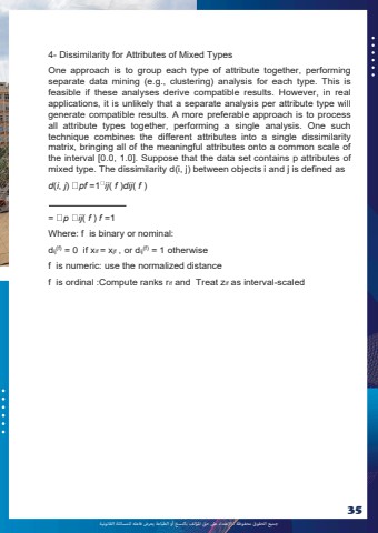 %u062c%u0645%u064a%u0639 %u0627%u0644%u062d%u0642%u0648%u0642 %u0645%u062d%u0641%u0648%u0638%u0629 %u0640 %u0627%u0625%u0644%u0639%u062a%u062f%u0627%u0621 %u0639%u0649%u0644 %u062d%u0642 %u0627%u0645%u0644%u0624%u0644%u0641 %u0628%u0627%u0644%u0646%u0633%u062e %u0623%u0648 %u0627%u0644%u0637%u0628%u0627%u0639%u0629 %u064a%u0639%u0631%u0636 %u0641%u0627%u0639%u0644%u0647 %u0644%u0644%u0645%u0633%u0627%u0626%u0644%u0629 %u0627%u0644%u0642%u0627%u0646%u0648%u0646%u064a%u0629354- Dissimilarity for Attributes of Mixed Types One approach is to group each type of attribute together, performing separate data mining (e.g., clustering) analysis for each type. This is feasible if these analyses derive compatible results. However, in real applications, it is unlikely that a separate analysis per attribute type will generate compatible results. A more preferable approach is to process all attribute types together, performing a single analysis. One such technique combines the different attributes into a single dissimilarity matrix, bringing all of the meaningful attributes onto a common scale of the interval [0.0, 1.0]. Suppose that the data set contains p attributes of mixed type. The dissimilarity d(i, j) between objects i and j is defined as d(i, j) pf =1 ij( f )dij( f )= p ij( f ) f =1Where: f is binary or nominal: dij(f) = 0 if xif = xjf , or dij(f) = 1 otherwise f is numeric: use the normalized distance f is ordinal :Compute ranks rif and Treat zif as interval-scaled