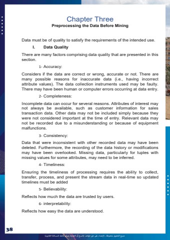 %u062c%u0645%u064a%u0639 %u0627%u0644%u062d%u0642%u0648%u0642 %u0645%u062d%u0641%u0648%u0638%u0629 %u0640 %u0627%u0625%u0644%u0639%u062a%u062f%u0627%u0621 %u0639%u0649%u0644 %u062d%u0642 %u0627%u0645%u0644%u0624%u0644%u0641 %u0628%u0627%u0644%u0646%u0633%u062e %u0623%u0648 %u0627%u0644%u0637%u0628%u0627%u0639%u0629 %u064a%u0639%u0631%u0636 %u0641%u0627%u0639%u0644%u0647 %u0644%u0644%u0645%u0633%u0627%u0626%u0644%u0629 %u0627%u0644%u0642%u0627%u0646%u0648%u0646%u064a%u062938Chapter ThreePreprocessing the Data Before MiningData must be of quality to satisfy the requirements of the intended use. I. Data Quality There are many factors comprising data quality that are presented in this section. 1- Accuracy: Considers if the data are correct or wrong, accurate or not. There are many possible reasons for inaccurate data (i.e., having incorrect attribute values). The data collection instruments used may be faulty. There may have been human or computer errors occurring at data entry. 2- Completeness: Incomplete data can occur for several reasons. Attributes of interest may not always be available, such as customer information for sales transaction data. Other data may not be included simply because they were not considered important at the time of entry. Relevant data may not be recorded due to a misunderstanding or because of equipment malfunctions. 3- Consistency: Data that were inconsistent with other recorded data may have been deleted. Furthermore, the recording of the data history or modifications may have been overlooked. Missing data, particularly for tuples with missing values for some attributes, may need to be inferred. 4- Timeliness: Ensuring the timeliness of processing requires the ability to collect, transfer, process, and present the stream data in real-time so updated timelines must be added 5- Believability: Reflects how much the data are trusted by users. 6- interpretability: Reflects how easy the data are understood.