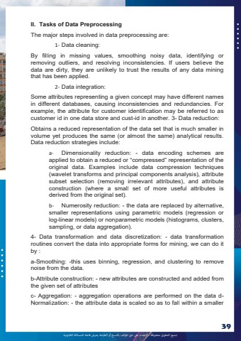 %u062c%u0645%u064a%u0639 %u0627%u0644%u062d%u0642%u0648%u0642 %u0645%u062d%u0641%u0648%u0638%u0629 %u0640 %u0627%u0625%u0644%u0639%u062a%u062f%u0627%u0621 %u0639%u0649%u0644 %u062d%u0642 %u0627%u0645%u0644%u0624%u0644%u0641 %u0628%u0627%u0644%u0646%u0633%u062e %u0623%u0648 %u0627%u0644%u0637%u0628%u0627%u0639%u0629 %u064a%u0639%u0631%u0636 %u0641%u0627%u0639%u0644%u0647 %u0644%u0644%u0645%u0633%u0627%u0626%u0644%u0629 %u0627%u0644%u0642%u0627%u0646%u0648%u0646%u064a%u062939II. Tasks of Data Preprocessing The major steps involved in data preprocessing are: 1- Data cleaning: By filling in missing values, smoothing noisy data, identifying or removing outliers, and resolving inconsistencies. If users believe the data are dirty, they are unlikely to trust the results of any data mining that has been applied. 2- Data integration: Some attributes representing a given concept may have different names in different databases, causing inconsistencies and redundancies. For example, the attribute for customer identification may be referred to as customer id in one data store and cust-id in another. 3- Data reduction: Obtains a reduced representation of the data set that is much smaller in volume yet produces the same (or almost the same) analytical results. Data reduction strategies include: a- Dimensionality reduction: - data encoding schemes are applied to obtain a reduced or %u201ccompressed%u201d representation of the original data. Examples include data compression techniques (wavelet transforms and principal components analysis), attribute subset selection (removing irrelevant attributes), and attribute construction (where a small set of more useful attributes is derived from the original set). b- Numerosity reduction: - the data are replaced by alternative, smaller representations using parametric models (regression or log-linear models) or nonparametric models (histograms, clusters, sampling, or data aggregation). 4- Data transformation and data discretization: - data transformation routines convert the data into appropriate forms for mining, we can do it by : a-Smoothing: -this uses binning, regression, and clustering to remove noise from the data. b-Attribute construction: - new attributes are constructed and added from the given set of attributes c- Aggregation: - aggregation operations are performed on the data dNormalization: - the attribute data is scaled so as to fall within a smaller