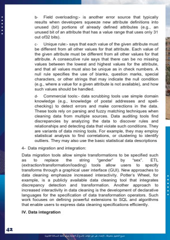 %u062c%u0645%u064a%u0639 %u0627%u0644%u062d%u0642%u0648%u0642 %u0645%u062d%u0641%u0648%u0638%u0629 %u0640 %u0627%u0625%u0644%u0639%u062a%u062f%u0627%u0621 %u0639%u0649%u0644 %u062d%u0642 %u0627%u0645%u0644%u0624%u0644%u0641 %u0628%u0627%u0644%u0646%u0633%u062e %u0623%u0648 %u0627%u0644%u0637%u0628%u0627%u0639%u0629 %u064a%u0639%u0631%u0636 %u0641%u0627%u0639%u0644%u0647 %u0644%u0644%u0645%u0633%u0627%u0626%u0644%u0629 %u0627%u0644%u0642%u0627%u0646%u0648%u0646%u064a%u062942b- Field overloading:- is another error source that typically results when developers squeeze new attribute definitions into unused (bit) portions of already defined attributes (e.g., an unused bit of an attribute that has a value range that uses only 31 out of32 bits). c- Unique rule:- says that each value of the given attribute must be different from all other values for that attribute. Each value of the given attribute must be different from all other values for that attribute. A consecutive rule says that there can be no missing values between the lowest and highest values for the attribute, and that all values must also be unique as in check numbers. A null rule specifies the use of blanks, question marks, special characters, or other strings that may indicate the null condition (e.g., where a value for a given attribute is not available), and how such values should be handled. d- Commercial tools:- data scrubbing tools use simple domain knowledge (e.g., knowledge of postal addresses and spellchecking) to detect errors and make corrections in the data. These tools rely on parsing and fuzzy matching techniques when cleaning data from multiple sources. Data auditing tools find discrepancies by analyzing the data to discover rules and relationships and detecting data that violate such conditions. They are variants of data mining tools. For example, they may employ statistical analysis to find correlations, or clustering to identify outliers. They may also use the basic statistical data descriptions 4- Data migration and integration: Data migration tools allow simple transformations to be specified such as to replace the string %u201cgender%u201d by %u201csex%u201d. ETL (extraction/transformation/loading) tools allow users to specify transforms through a graphical user interface (GUI). New approaches to data cleaning emphasize increased interactivity. Potter%u2019s Wheel, for example, is a publicly available data cleaning tool that integrates discrepancy detection and transformation. Another approach to increased interactivity in data cleaning is the development of declarative languages for the specification of data transformation operators. Such work focuses on defining powerful extensions to SQL and algorithms that enable users to express data cleaning specifications efficiently. IV. Data integration