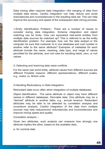 %u062c%u0645%u064a%u0639 %u0627%u0644%u062d%u0642%u0648%u0642 %u0645%u062d%u0641%u0648%u0638%u0629 %u0640 %u0627%u0625%u0644%u0639%u062a%u062f%u0627%u0621 %u0639%u0649%u0644 %u062d%u0642 %u0627%u0645%u0644%u0624%u0644%u0641 %u0628%u0627%u0644%u0646%u0633%u062e %u0623%u0648 %u0627%u0644%u0637%u0628%u0627%u0639%u0629 %u064a%u0639%u0631%u0636 %u0641%u0627%u0639%u0644%u0647 %u0644%u0644%u0645%u0633%u0627%u0626%u0644%u0629 %u0627%u0644%u0642%u0627%u0646%u0648%u0646%u064a%u062943Data mining often requires data integration%u2014the merging of data from multiple data stores. Careful integration can help reduce and avoid redundancies and inconsistencies in the resulting data set. This can help improve the accuracy and speed of the subsequent data mining process. 1-Entity Identification Problem:- There are a number of issues to consider during data integration. Schema integration and object matching can be tricky. How can equivalent real-world entities from multiple data sources be matched up? This is referred to as the entity identification problem. For example, how can the data analyst or the computer be sure that customer id in one database and cust number in another refer to the same attribute? Examples of metadata for each attribute include the name, meaning, data type, and range of values permitted for the attribute, and null rules for handling blank, zero, or null values. 2- Detecting and resolving data value conflicts: For the same real world entity, attribute values from different sources are different Possible reasons: different representations, different scales, e.g., metric vs. British units 3-Handling Redundancy in Data Integration: Redundant data occur often when integration of multiple databases.Object identification: The same attribute or object may have different names in different databases. Derivable data: One attribute may be a %u201cderived%u201d attribute in another table, e.g., annual revenue. Redundant attributes may be able to be detected by correlation analysis and covariance analysis, Careful integration of the data from multiple sources may help reduce/avoid redundancies and inconsistencies and improve mining speed and quality. Correlation analysis :-Given two attributes, such analysis can measure how strongly one attribute implies the other, based on the available data. a- for nominal data