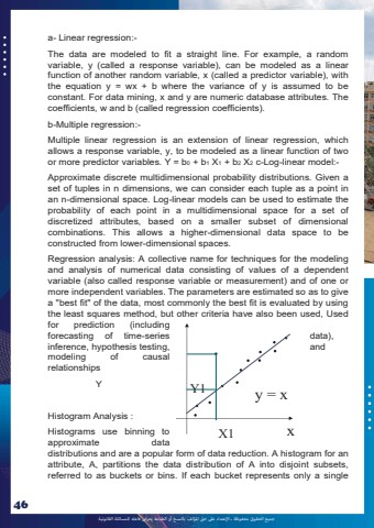 %u062c%u0645%u064a%u0639 %u0627%u0644%u062d%u0642%u0648%u0642 %u0645%u062d%u0641%u0648%u0638%u0629 %u0640 %u0627%u0625%u0644%u0639%u062a%u062f%u0627%u0621 %u0639%u0649%u0644 %u062d%u0642 %u0627%u0645%u0644%u0624%u0644%u0641 %u0628%u0627%u0644%u0646%u0633%u062e %u0623%u0648 %u0627%u0644%u0637%u0628%u0627%u0639%u0629 %u064a%u0639%u0631%u0636 %u0641%u0627%u0639%u0644%u0647 %u0644%u0644%u0645%u0633%u0627%u0626%u0644%u0629 %u0627%u0644%u0642%u0627%u0646%u0648%u0646%u064a%u062946a- Linear regression:-The data are modeled to fit a straight line. For example, a random variable, y (called a response variable), can be modeled as a linear function of another random variable, x (called a predictor variable), with the equation y = wx + b where the variance of y is assumed to be constant. For data mining, x and y are numeric database attributes. The coefficients, w and b (called regression coefficients). b-Multiple regression:-Multiple linear regression is an extension of linear regression, which allows a response variable, y, to be modeled as a linear function of two or more predictor variables. Y = b0 + b1 X1 + b2 X2 c-Log-linear model:-Approximate discrete multidimensional probability distributions. Given a set of tuples in n dimensions, we can consider each tuple as a point in an n-dimensional space. Log-linear models can be used to estimate the probability of each point in a multidimensional space for a set of discretized attributes, based on a smaller subset of dimensional combinations. This allows a higher-dimensional data space to be constructed from lower-dimensional spaces. Regression analysis: A collective name for techniques for the modeling and analysis of numerical data consisting of values of a dependent variable (also called response variable or measurement) and of one or more independent variables. The parameters are estimated so as to give a \the least squares method, but other criteria have also been used, Used for prediction (including forecasting of time-series data), inference, hypothesis testing, and modeling of causal relationships Y Histogram Analysis : Histograms use binning to approximate data distributions and are a popular form of data reduction. A histogram for an attribute, A, partitions the data distribution of A into disjoint subsets, referred to as buckets or bins. If each bucket represents only a single xy = x X1Y1