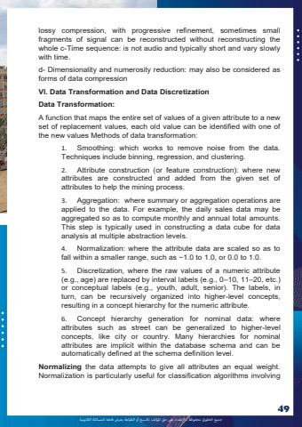 %u062c%u0645%u064a%u0639 %u0627%u0644%u062d%u0642%u0648%u0642 %u0645%u062d%u0641%u0648%u0638%u0629 %u0640 %u0627%u0625%u0644%u0639%u062a%u062f%u0627%u0621 %u0639%u0649%u0644 %u062d%u0642 %u0627%u0645%u0644%u0624%u0644%u0641 %u0628%u0627%u0644%u0646%u0633%u062e %u0623%u0648 %u0627%u0644%u0637%u0628%u0627%u0639%u0629 %u064a%u0639%u0631%u0636 %u0641%u0627%u0639%u0644%u0647 %u0644%u0644%u0645%u0633%u0627%u0626%u0644%u0629 %u0627%u0644%u0642%u0627%u0646%u0648%u0646%u064a%u062949lossy compression, with progressive refinement, sometimes small fragments of signal can be reconstructed without reconstructing the whole c-Time sequence: is not audio and typically short and vary slowly with time. d- Dimensionality and numerosity reduction: may also be considered as forms of data compression VI. Data Transformation and Data Discretization Data Transformation: A function that maps the entire set of values of a given attribute to a new set of replacement values, each old value can be identified with one of the new values Methods of data transformation: 1. Smoothing: which works to remove noise from the data. Techniques include binning, regression, and clustering. 2. Attribute construction (or feature construction): where new attributes are constructed and added from the given set of attributes to help the mining process. 3. Aggregation: where summary or aggregation operations are applied to the data. For example, the daily sales data may be aggregated so as to compute monthly and annual total amounts. This step is typically used in constructing a data cube for data analysis at multiple abstraction levels. 4. Normalization: where the attribute data are scaled so as to fall within a smaller range, such as %u22121.0 to 1.0, or 0.0 to 1.0. 5. Discretization, where the raw values of a numeric attribute (e.g., age) are replaced by interval labels (e.g., 0%u201310, 11%u201320, etc.) or conceptual labels (e.g., youth, adult, senior). The labels, in turn, can be recursively organized into higher-level concepts, resulting in a concept hierarchy for the numeric attribute. 6. Concept hierarchy generation for nominal data: where attributes such as street can be generalized to higher-level concepts, like city or country. Many hierarchies for nominal attributes are implicit within the database schema and can be automatically defined at the schema definition level. Normalizing the data attempts to give all attributes an equal weight. Normalization is particularly useful for classification algorithms involving