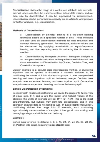 %u062c%u0645%u064a%u0639 %u0627%u0644%u062d%u0642%u0648%u0642 %u0645%u062d%u0641%u0648%u0638%u0629 %u0640 %u0627%u0625%u0644%u0639%u062a%u062f%u0627%u0621 %u0639%u0649%u0644 %u062d%u0642 %u0627%u0645%u0644%u0624%u0644%u0641 %u0628%u0627%u0644%u0646%u0633%u062e %u0623%u0648 %u0627%u0644%u0637%u0628%u0627%u0639%u0629 %u064a%u0639%u0631%u0636 %u0641%u0627%u0639%u0644%u0647 %u0644%u0644%u0645%u0633%u0627%u0626%u0644%u0629 %u0627%u0644%u0642%u0627%u0646%u0648%u0646%u064a%u062951Discretization divides the range of a continuous attribute into intervals, Interval labels can then be used to replace actual data values, reduce data size by discretization it can be supervised vs. unsupervised. Discretization can be performed recursively on an attribute and prepare for further analysis, e.g., classification. Methods of Discretization: a- Discretization by Binning:- binning is a top-down splitting technique based on a specified number of bins. These methods are also used as discretization methods for data reduction and concept hierarchy generation. For example, attribute values can be discretized by applying equal-width or equal-frequency binning, and then replacing each bin value by the bin mean or median. b- Discretization by Histogram Analysis:- histogram analysis is an unsupervised discretization technique because it does not use class information. c- Discretization by Cluster, Decision Tree, and Correlation Analyses:-Cluster analysis is a popular data discretization method. A clustering algorithm can be applied to discretize a numeric attribute, A, by partitioning the values of A into clusters or groups. It uses unsupervised learning and uses top-down split or bottom-up merge. Decision tree analysis uses supervised learning and uses topdown split. Correlation analysis uses unsupervised learning and uses bottom-up split. Simple Discretization by Binning : In equal-width (distance) partitioning, we divide the range into N intervals of equal size. If A and B are the lowest and highest values of the attribute, the width of intervals will be: W = (B %u2013A)/N. This is the most straightforward, but outliers may dominate presentation, and in this approach skewed data is not handled well. In Equal-depth (frequency), partitioning divides the range into N intervals, each containing approximately same number of samples it has good data scaling and managing categorical attributes can be tricky. Example : Sorted data for price (in dollars): 4, 8, 9, 15, 21, 21, 24, 25, 26, 28, 29, 34 Partition into equal-frequency (equi-depth) bins: