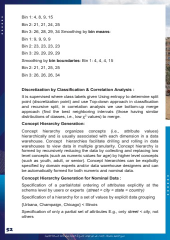 %u062c%u0645%u064a%u0639 %u0627%u0644%u062d%u0642%u0648%u0642 %u0645%u062d%u0641%u0648%u0638%u0629 %u0640 %u0627%u0625%u0644%u0639%u062a%u062f%u0627%u0621 %u0639%u0649%u0644 %u062d%u0642 %u0627%u0645%u0644%u0624%u0644%u0641 %u0628%u0627%u0644%u0646%u0633%u062e %u0623%u0648 %u0627%u0644%u0637%u0628%u0627%u0639%u0629 %u064a%u0639%u0631%u0636 %u0641%u0627%u0639%u0644%u0647 %u0644%u0644%u0645%u0633%u0627%u0626%u0644%u0629 %u0627%u0644%u0642%u0627%u0646%u0648%u0646%u064a%u062952Bin 1: 4, 8, 9, 15 Bin 2: 21, 21, 24, 25 Bin 3: 26, 28, 29, 34 Smoothing by bin means: Bin 1: 9, 9, 9, 9 Bin 2: 23, 23, 23, 23 Bin 3: 29, 29, 29, 29 Smoothing by bin boundaries: Bin 1: 4, 4, 4, 15 Bin 2: 21, 21, 25, 25 Bin 3: 26, 26, 26, 34 Discretization by Classification & Correlation Analysis : It is supervised where class labels given Using entropy to determine split point (discretization point) and use Top-down approach in classification and recursive split, in correlation analysis we use bottom-up merge approach (find the best neighboring intervals (those having similar distributions of classes, i.e., low %u03c72 values) to merge. Concept Hierarchy Generation: Concept hierarchy organizes concepts (i.e., attribute values) hierarchically and is usually associated with each dimension in a data warehouse. Concept hierarchies facilitate drilling and rolling in data warehouses to view data in multiple granularity. Concept hierarchy is formed by recursively reducing the data by collecting and replacing low level concepts (such as numeric values for age) by higher level concepts (such as youth, adult, or senior). Concept hierarchies can be explicitly specified by domain experts and/or data warehouse designers and can be automatically formed for both numeric and nominal data. Concept Hierarchy Generation for Nominal Data : Specification of a partial/total ordering of attributes explicitly at the schema level by users or experts (street < city < state < country)Specification of a hierarchy for a set of values by explicit data grouping {Urbana, Champaign, Chicago} < Illinois Specification of only a partial set of attributes E.g., only street < city, not others