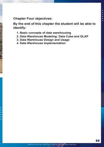 %u062c%u0645%u064a%u0639 %u0627%u0644%u062d%u0642%u0648%u0642 %u0645%u062d%u0641%u0648%u0638%u0629 %u0640 %u0627%u0625%u0644%u0639%u062a%u062f%u0627%u0621 %u0639%u0649%u0644 %u062d%u0642 %u0627%u0645%u0644%u0624%u0644%u0641 %u0628%u0627%u0644%u0646%u0633%u062e %u0623%u0648 %u0627%u0644%u0637%u0628%u0627%u0639%u0629 %u064a%u0639%u0631%u0636 %u0641%u0627%u0639%u0644%u0647 %u0644%u0644%u0645%u0633%u0627%u0626%u0644%u0629 %u0627%u0644%u0642%u0627%u0646%u0648%u0646%u064a%u062955Chapter Four objectives:By the end of this chapter the student will be able to identify:1. Basic concepts of data warehousing 2. Data Warehouse Modeling: Data Cube and OLAP 3. Data Warehouse Design and Usage 4. Data Warehouse Implementation