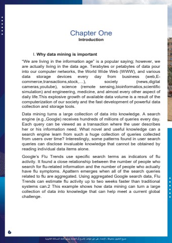 %u062c%u0645%u064a%u0639 %u0627%u0644%u062d%u0642%u0648%u0642 %u0645%u062d%u0641%u0648%u0638%u0629 %u0640 %u0627%u0625%u0644%u0639%u062a%u062f%u0627%u0621 %u0639%u0649%u0644 %u062d%u0642 %u0627%u0645%u0644%u0624%u0644%u0641 %u0628%u0627%u0644%u0646%u0633%u062e %u0623%u0648 %u0627%u0644%u0637%u0628%u0627%u0639%u0629 %u064a%u0639%u0631%u0636 %u0641%u0627%u0639%u0644%u0647 %u0644%u0644%u0645%u0633%u0627%u0626%u0644%u0629 %u0627%u0644%u0642%u0627%u0646%u0648%u0646%u064a%u06296Chapter OneIntroductionI. Why data mining is important %u201cWe are living in the information age%u201d is a popular saying; however, we are actually living in the data age. Terabytes or petabytes of data pour into our computer networks, the World Wide Web (WWW), and various data storage devices every day from business (web,Ecommerce,transactions,stock,%u2026), society (news,digital cameras,youtube), science (remote sensing,bioinformatics,scientific simulation) and engineering, medicine, and almost every other aspect of daily life.This explosive growth of available data volume is a result of the computerization of our society and the fast development of powerful data collection and storage tools. Data mining turns a large collection of data into knowledge. A search engine (e.g.,Google) receives hundreds of millions of queries every day. Each query can be viewed as a transaction where the user describes her or his information need. What novel and useful knowledge can a search engine learn from such a huge collection of queries collected from users over time? Interestingly, some patterns found in user search queries can disclose invaluable knowledge that cannot be obtained by reading individual data items alone. Google%u2019s Flu Trends use specific search terms as indicators of flu activity. It found a close relationship between the number of people who search for flu-related information and the number of people who actually have flu symptoms. Apattern emerges when all of the search queries related to flu are aggregated. Using aggregated Google search data, Flu Trends can estimate flu activity up to two weeks faster than traditional systems can.2 This example shows how data mining can turn a large collection of data into knowledge that can help meet a current global challenge.