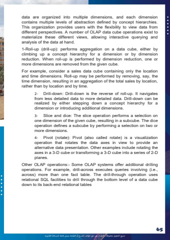%u062c%u0645%u064a%u0639 %u0627%u0644%u062d%u0642%u0648%u0642 %u0645%u062d%u0641%u0648%u0638%u0629 %u0640 %u0627%u0625%u0644%u0639%u062a%u062f%u0627%u0621 %u0639%u0649%u0644 %u062d%u0642 %u0627%u0645%u0644%u0624%u0644%u0641 %u0628%u0627%u0644%u0646%u0633%u062e %u0623%u0648 %u0627%u0644%u0637%u0628%u0627%u0639%u0629 %u064a%u0639%u0631%u0636 %u0641%u0627%u0639%u0644%u0647 %u0644%u0644%u0645%u0633%u0627%u0626%u0644%u0629 %u0627%u0644%u0642%u0627%u0646%u0648%u0646%u064a%u062965data are organized into multiple dimensions, and each dimension contains multiple levels of abstraction defined by concept hierarchies. This organization provides users with the flexibility to view data from different perspectives. A number of OLAP data cube operations exist to materialize these different views, allowing interactive querying and analysis of the data at hand. 1-Roll-up (drill-up): performs aggregation on a data cube, either by climbing up a concept hierarchy for a dimension or by dimension reduction. When roll-up is performed by dimension reduction, one or more dimensions are removed from the given cube. For example, consider a sales data cube containing only the location and time dimensions. Roll-up may be performed by removing, say, the time dimension, resulting in an aggregation of the total sales by location, rather than by location and by time. 2- Drill-down: Drill-down is the reverse of roll-up. It navigates from less detailed data to more detailed data. Drill-down can be realized by either stepping down a concept hierarchy for a dimension or introducing additional dimensions. 3- Slice and dice: The slice operation performs a selection on one dimension of the given cube, resulting in a subcube. The dice operation defines a subcube by performing a selection on two or more dimensions. 4- Pivot (rotate): Pivot (also called rotate) is a visualization operation that rotates the data axes in view to provide an alternative data presentation. Other examples include rotating the axes in a 3-D cube or transforming a 3-D cube into a series of 2-D planes. Other OLAP operations:- Some OLAP systems offer additional drilling operations. For example, drill-across executes queries involving (i.e., across) more than one fact table. The drill-through operation uses relational SQL facilities to drill through the bottom level of a data cube down to its back-end relational tables