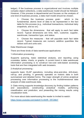 %u062c%u0645%u064a%u0639 %u0627%u0644%u062d%u0642%u0648%u0642 %u0645%u062d%u0641%u0648%u0638%u0629 %u0640 %u0627%u0625%u0644%u0639%u062a%u062f%u0627%u0621 %u0639%u0649%u0644 %u062d%u0642 %u0627%u0645%u0644%u0624%u0644%u0641 %u0628%u0627%u0644%u0646%u0633%u062e %u0623%u0648 %u0627%u0644%u0637%u0628%u0627%u0639%u0629 %u064a%u0639%u0631%u0636 %u0641%u0627%u0639%u0644%u0647 %u0644%u0644%u0645%u0633%u0627%u0626%u0644%u0629 %u0627%u0644%u0642%u0627%u0646%u0648%u0646%u064a%u062968ledger). If the business process is organizational and involves multiple complex object collections, a data warehouse model should be followed. However, if the process is departmental and focuses on the analysis of one kind of business process, a data mart model should be chosen. 2- Choose the business process grain: which is the fundamental, atomic level of data to be represented in the fact table for this process (e.g., individual transactions, individual daily snapshots, and so on). 3- Choose the dimensions: that will apply to each fact table record. Typical dimensions are time, item, customer, supplier, warehouse, transaction type, and status. 4- Choose the measures : that will populate each fact table record. Typical measures are numeric additive quantities like dollars sold and units sold. Data Warehouse Usage: There are three kinds of data warehouse applications: 1-Information processing : Supports querying, basic statistical analysis, and reporting using crosstabs, tables, charts, or graphs. A current trend in data warehouse information processing is to construct low-cost web-based accessing tools that are then integrated with web browsers. 2-Analytical processing : supports basic OLAP operations, including slice-and-dice, drill-down, roll-up, and pivoting. It generally operates on historic data in both summarized and detailed forms. The major strength of online analytical processing over information processing is the multidimensional data analysis of data warehouse data. 3- Data mining supports knowledge discovery by finding hidden patterns and associations, constructing analytical models, performing classification and prediction, and presenting the mining results using visualization tools. For more about data warehousing the reader is invited to watch: https://www.youtube.com/watch?v=AHR_7jFCMeY