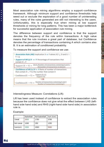 %u062c%u0645%u064a%u0639 %u0627%u0644%u062d%u0642%u0648%u0642 %u0645%u062d%u0641%u0648%u0638%u0629 %u0640 %u0627%u0625%u0644%u0639%u062a%u062f%u0627%u0621 %u0639%u0649%u0644 %u062d%u0642 %u0627%u0645%u0644%u0624%u0644%u0641 %u0628%u0627%u0644%u0646%u0633%u062e %u0623%u0648 %u0627%u0644%u0637%u0628%u0627%u0639%u0629 %u064a%u0639%u0631%u0636 %u0641%u0627%u0639%u0644%u0647 %u0644%u0644%u0645%u0633%u0627%u0626%u0644%u0629 %u0627%u0644%u0642%u0627%u0646%u0648%u0646%u064a%u062984Most association rule mining algorithms employ a support%u2013confidence framework. Although minimum support and confidence thresholds help weed out or exclude the exploration of a good number of uninteresting rules, many of the rules generated are still not interesting to the users. Unfortunately, this is especially true when mining at low support thresholds or mining for long patterns. This has been a major bottleneck for successful application of association rule mining. The difference between support and confidence is that the support denotes the frequency of the rule within transactions. A high value means that the rule involves a great part of database, but Confidence denotes the percentage of transactions containing A which contains also B. It is an estimation of conditioned probability. To measure the support and confidence we use: Interestingness Measure: Correlations (Lift): Lift has been used instead of confidence to extract the association rules because the confidence does not give what the effect between LHS (lefthand side hand side) and RHS (right-hand side hand side) in association rule is. Example: