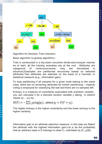 %u062c%u0645%u064a%u0639 %u0627%u0644%u062d%u0642%u0648%u0642 %u0645%u062d%u0641%u0648%u0638%u0629 %u0640 %u0627%u0625%u0644%u0639%u062a%u062f%u0627%u0621 %u0639%u0649%u0644 %u062d%u0642 %u0627%u0645%u0644%u0624%u0644%u0641 %u0628%u0627%u0644%u0646%u0633%u062e %u0623%u0648 %u0627%u0644%u0637%u0628%u0627%u0639%u0629 %u064a%u0639%u0631%u0636 %u0641%u0627%u0639%u0644%u0647 %u0644%u0644%u0645%u0633%u0627%u0626%u0644%u0629 %u0627%u0644%u0642%u0627%u0646%u0648%u0646%u064a%u062991Algorithm for Decision Tree Induction: Basic algorithm (a greedy algorithm):- Tree is constructed in a top-down recursive divide-and-conquer manner as at start, all the training examples are at the root . Attributes are categorical (if continuousvalued, they are discretized in advance).Examples are partitioned recursively based on selected attributes.Test attributes are selected on the basis of a heuristic or statistical measure (e.g., information gain). To stop partitioning if all samples for a given node belong to the same class ,there are no remaining attributes for further partitioning %u2013 majority voting is employed for classifying the leaf and there are no samples left. Entropy is a measure of uncertainty associated with arandom variable , you can calculate it for a discrete random variable y taking m distinct values {y1%u2026ym} by: The higher entropy is the higher uncertainty and the lower entropy is the higher certainty Information gain is an attribute selection measure: in this step we Select the attribute with the highest information gain.Let pi be the probability that an arbitrary tuple in D belongs to class Ci, estimated by |Ci, D|/|D|.