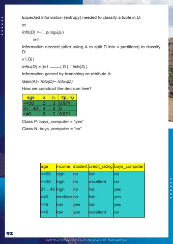 %u062c%u0645%u064a%u0639 %u0627%u0644%u062d%u0642%u0648%u0642 %u0645%u062d%u0641%u0648%u0638%u0629 %u0640 %u0627%u0625%u0644%u0639%u062a%u062f%u0627%u0621 %u0639%u0649%u0644 %u062d%u0642 %u0627%u0645%u0644%u0624%u0644%u0641 %u0628%u0627%u0644%u0646%u0633%u062e %u0623%u0648 %u0627%u0644%u0637%u0628%u0627%u0639%u0629 %u064a%u0639%u0631%u0636 %u0641%u0627%u0639%u0644%u0647 %u0644%u0644%u0645%u0633%u0627%u0626%u0644%u0629 %u0627%u0644%u0642%u0627%u0646%u0648%u0646%u064a%u062992Expected information (entropy) needed to classify a tuple in D: mInfo(D) =%u2212 pi log2(pi )i=1Information needed (after using A to split D into v partitions) to classify D: v | Dj |InfoA(D) = j=1 | D | Info(Dj ) Information gained by branching on attribute A: Gain(A)= Info(D)%u2212 InfoA(D)How we construct the decision tree? Class P: buys_computer = %u201cyes%u201d Class N: buys_computer = %u201cno%u201d age income student credit_rating buys_computer<=30 high no fair no<=30 high no excellent no31%u202640 high no fair yes>40 medium no fair yes>40 low yes fair yes>40 low yes excellent no