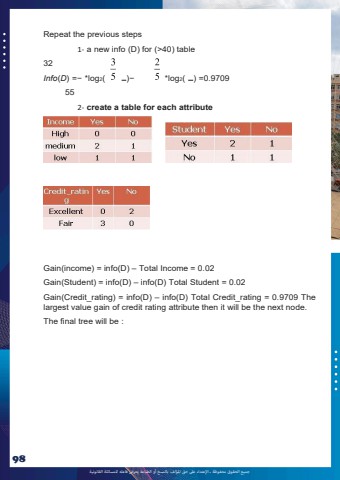 %u062c%u0645%u064a%u0639 %u0627%u0644%u062d%u0642%u0648%u0642 %u0645%u062d%u0641%u0648%u0638%u0629 %u0640 %u0627%u0625%u0644%u0639%u062a%u062f%u0627%u0621 %u0639%u0649%u0644 %u062d%u0642 %u0627%u0645%u0644%u0624%u0644%u0641 %u0628%u0627%u0644%u0646%u0633%u062e %u0623%u0648 %u0627%u0644%u0637%u0628%u0627%u0639%u0629 %u064a%u0639%u0631%u0636 %u0641%u0627%u0639%u0644%u0647 %u0644%u0644%u0645%u0633%u0627%u0626%u0644%u0629 %u0627%u0644%u0642%u0627%u0646%u0648%u0646%u064a%u062998Repeat the previous steps 1- a new info (D) for (>40) table 32Info(D) =%u2212 *log2( )%u2212 *log2( ) =0.9709552- create a table for each attribute Gain(income) = info(D) %u2013 Total Income = 0.02 Gain(Student) = info(D) %u2013 info(D) Total Student = 0.02 Gain(Credit_rating) = info(D) %u2013 info(D) Total Credit_rating = 0.9709 The largest value gain of credit rating attribute then it will be the next node. The final tree will be :