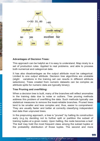 %u062c%u0645%u064a%u0639 %u0627%u0644%u062d%u0642%u0648%u0642 %u0645%u062d%u0641%u0648%u0638%u0629 %u0640 %u0627%u0625%u0644%u0639%u062a%u062f%u0627%u0621 %u0639%u0649%u0644 %u062d%u0642 %u0627%u0645%u0644%u0624%u0644%u0641 %u0628%u0627%u0644%u0646%u0633%u062e %u0623%u0648 %u0627%u0644%u0637%u0628%u0627%u0639%u0629 %u064a%u0639%u0631%u0636 %u0641%u0627%u0639%u0644%u0647 %u0644%u0644%u0645%u0633%u0627%u0626%u0644%u0629 %u0627%u0644%u0642%u0627%u0646%u0648%u0646%u064a%u062999 Advantages of Decision Trees: This approach can be helpful as it is easy to understand. Map nicely to a set of production rules. Applied to real problems. and able to process both numerical and categorical data. It has also disadvantages as the output attribute must be categorical. Limited to one output attribute. Decision tree algorithms are unstable (slight variations in the training set can results in different attribute selections). Trees created from numeric datasets can be complex as attribute splits for numeric data are typically binary). Tree Pruning and overfitting: When a decision tree is built, many of the branches will reflect anomalies in the training data due to noise or outliers. Tree pruning methods address this problem of overfitting the data. Such methods typically use statistical measures to remove the least-reliable branches. Pruned trees tend to be smaller and less complex and, thus, easier to comprehend. They are usually faster and better at correctly classifying independent test data than unpruned trees. In the prepruning approach, a tree is %u201cpruned%u201d by halting its construction early (e.g.,by deciding not to further split or partition the subset of training tuples at a given node). Upon halting, the node becomes a leaf. The leaf may hold the most frequent class among the subset tuples or the probability distribution of those tuples. The second and more