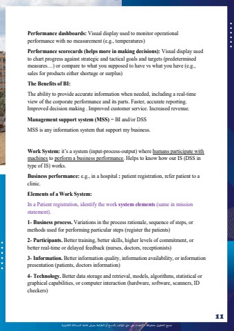 %u062c%u0645%u064a%u0639 %u0627%u0644%u062d%u0642%u0648%u0642 %u0645%u062d%u0641%u0648%u0638%u0629 %u0640 %u0627%u0625%u0644%u0639%u062a%u062f%u0627%u0621 %u0639%u0649%u0644 %u062d%u0642 %u0627%u0645%u0644%u0624%u0644%u0641 %u0628%u0627%u0644%u0646%u0633%u062e %u0623%u0648 %u0627%u0644%u0637%u0628%u0627%u0639%u0629 %u064a%u0639%u0631%u0636 %u0641%u0627%u0639%u0644%u0647 %u0644%u0644%u0645%u0633%u0627%u0626%u0644%u0629 %u0627%u0644%u0642%u0627%u0646%u0648%u0646%u064a%u062911lOMoAR cPSD|10120753Performance dashboards: Visual display used to monitor operationalperformance with no measurement (e.g., temperatures)Performance scorecards (helps more in making decisions): Visual display usedto chart progress against strategic and tactical goals and targets (predeterminedmeasures%u2026) or compare to what you supposed to have vs what you have (e.g.,sales for products either shortage or surplus)The Benefits of BI:The ability to provide accurate information when needed, including a real-timeview of the corporate performance and its parts. Faster, accurate reporting.Improved decision making . Improved customer service. Increased revenue.Management support system (MSS) = BI and/or DSSMSS is any information system that support my business.Work System: it%u2019s a system (input-process-output) where humans participate withmachines to perform a business performance. Helps to know how our IS (DSS intype of IS) works.Business performance: e.g., in a hospital : patient registration, refer patient to aclinic.Elements of a Work System:In a Patient registration, identify the work system elements (same in missionstatement).1- Business process. Variations in the process rationale, sequence of steps, ormethods used for performing particular steps (register the patients)2- Participants. Better training, better skills, higher levels of commitment, orbetter real-time or delayed feedback (nurses, doctors, receptionists)3- Information. Better information quality, information availability, or informationpresentation (patients, doctors information)4- Technology. Better data storage and retrieval, models, algorithms, statistical orgraphical capabilities, or computer interaction (hardware, software, scanners, IDcheckers)