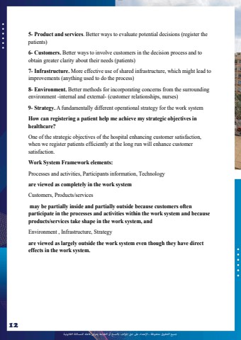 %u062c%u0645%u064a%u0639 %u0627%u0644%u062d%u0642%u0648%u0642 %u0645%u062d%u0641%u0648%u0638%u0629 %u0640 %u0627%u0625%u0644%u0639%u062a%u062f%u0627%u0621 %u0639%u0649%u0644 %u062d%u0642 %u0627%u0645%u0644%u0624%u0644%u0641 %u0628%u0627%u0644%u0646%u0633%u062e %u0623%u0648 %u0627%u0644%u0637%u0628%u0627%u0639%u0629 %u064a%u0639%u0631%u0636 %u0641%u0627%u0639%u0644%u0647 %u0644%u0644%u0645%u0633%u0627%u0626%u0644%u0629 %u0627%u0644%u0642%u0627%u0646%u0648%u0646%u064a%u062912lOMoAR cPSD|101207535- Product and services. Better ways to evaluate potential decisions (register thepatients)6- Customers. Better ways to involve customers in the decision process and toobtain greater clarity about their needs (patients)7- Infrastructure. More effective use of shared infrastructure, which might lead toimprovements (anything used to do the process)8- Environment. Better methods for incorporating concerns from the surroundingenvironment -internal and external- (customer relationships, nurses)9- Strategy. A fundamentally different operational strategy for the work systemHow can registering a patient help me achieve my strategic objectives inhealthcare?One of the strategic objectives of the hospital enhancing customer satisfaction,when we register patients efficiently at the long run will enhance customersatisfaction.Work System Framework elements:Processes and activities, Participants information, Technologyare viewed as completely in the work systemCustomers, Products/servicesmay be partially inside and partially outside because customers oftenparticipate in the processes and activities within the work system and becauseproducts/services take shape in the work system, andEnvironment , Infrastructure, Strategyare viewed as largely outside the work system even though they have directeffects in the work system.