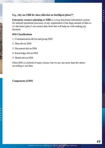 %u062c%u0645%u064a%u0639 %u0627%u0644%u062d%u0642%u0648%u0642 %u0645%u062d%u0641%u0648%u0638%u0629 %u0640 %u0627%u0625%u0644%u0639%u062a%u062f%u0627%u0621 %u0639%u0649%u0644 %u062d%u0642 %u0627%u0645%u0644%u0624%u0644%u0641 %u0628%u0627%u0644%u0646%u0633%u062e %u0623%u0648 %u0627%u0644%u0637%u0628%u0627%u0639%u0629 %u064a%u0639%u0631%u0636 %u0641%u0627%u0639%u0644%u0647 %u0644%u0644%u0645%u0633%u0627%u0626%u0644%u0629 %u0627%u0644%u0642%u0627%u0646%u0648%u0646%u064a%u062917lOMoAR cPSD|10120753E.g., why use ERB for data collection on Intelligent phase??Enterprise resource planning or ERB is a cross functional information systemfor internal operations processes of any organization it has huge amount of data soit%u2019s the better place I can extract data from that will help me with making mydecision.DSS Classifications1- Communication-driven and group DSS2- Data-driven DSS3- Document-driven DSS4- Knowledge-driven DSS5- Model-driven DSSOften DSS is a hybrid of many classes, but we use one more than the othersaccording to our data.Components of DSS