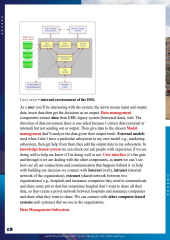 %u062c%u0645%u064a%u0639 %u0627%u0644%u062d%u0642%u0648%u0642 %u0645%u062d%u0641%u0648%u0638%u0629 %u0640 %u0627%u0625%u0644%u0639%u062a%u062f%u0627%u0621 %u0639%u0649%u0644 %u062d%u0642 %u0627%u0645%u0644%u0624%u0644%u0641 %u0628%u0627%u0644%u0646%u0633%u062e %u0623%u0648 %u0627%u0644%u0637%u0628%u0627%u0639%u0629 %u064a%u0639%u0631%u0636 %u0641%u0627%u0639%u0644%u0647 %u0644%u0644%u0645%u0633%u0627%u0626%u0644%u0629 %u0627%u0644%u0642%u0627%u0646%u0648%u0646%u064a%u062918lOMoAR cPSD|10120753Grey area = internal environment of the DSS.As s user you%u2019ll be interacting with the system, the arrow means input and outputdata, insert data then get the decisions as an output. Data managementcomponents extract data from ERB, legacy system (historical data), web. Thedirection of data movement there is one sided because I extract data (external orinternal) but not sending out or output. Then give data to the chosen Modelmanagement that%u2019ll analyze the data given then output result. External modelsused when I don%u2019t have a particular subsystem in my own model e.g., marketingsubsystem, then get help from them then add the output data to my subsystem. Inknowledge-based system we can check our ask people with experience if we aredoing well to help me know if I%u2019m doing well or not. User interface it%u2019s the gateand through it we are dealing with the other components, as users we can%u2019t seehow our all our connections and communication that happens behind it. to helpwith building my decision we connect with Internet (web), intranet (internalnetwork of the organization), extranet (shared network between twoorganizations) e.g., hospitals and insurance companies they need to communicateand share some privet data but sometimes hospital don%u2019t want to share all theirdata, so they create a privet network between hospitals and insurance companiesand share what they want to share. We can connect with other computer-basedsystems (sub systems) that we use in the organization.Data Management Subsystem