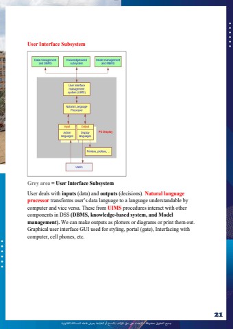 %u062c%u0645%u064a%u0639 %u0627%u0644%u062d%u0642%u0648%u0642 %u0645%u062d%u0641%u0648%u0638%u0629 %u0640 %u0627%u0625%u0644%u0639%u062a%u062f%u0627%u0621 %u0639%u0649%u0644 %u062d%u0642 %u0627%u0645%u0644%u0624%u0644%u0641 %u0628%u0627%u0644%u0646%u0633%u062e %u0623%u0648 %u0627%u0644%u0637%u0628%u0627%u0639%u0629 %u064a%u0639%u0631%u0636 %u0641%u0627%u0639%u0644%u0647 %u0644%u0644%u0645%u0633%u0627%u0626%u0644%u0629 %u0627%u0644%u0642%u0627%u0646%u0648%u0646%u064a%u062921lOMoAR cPSD|10120753User Interface SubsystemGrey area = User Interface SubsystemUser deals with inputs (data) and outputs (decisions). Natural languageprocessor transforms user%u2019s data language to a language understandable bycomputer and vice versa. These from UIMS procedures interact with othercomponents in DSS (DBMS, knowledge-based system, and Modelmanagement). We can make outputs as plotters or diagrams or print them out.Graphical user interface GUI used for styling, portal (gate), Interfacing withcomputer, cell phones, etc.