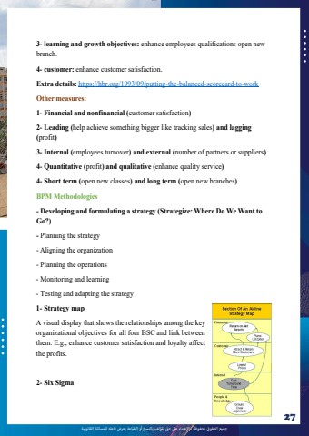 %u062c%u0645%u064a%u0639 %u0627%u0644%u062d%u0642%u0648%u0642 %u0645%u062d%u0641%u0648%u0638%u0629 %u0640 %u0627%u0625%u0644%u0639%u062a%u062f%u0627%u0621 %u0639%u0649%u0644 %u062d%u0642 %u0627%u0645%u0644%u0624%u0644%u0641 %u0628%u0627%u0644%u0646%u0633%u062e %u0623%u0648 %u0627%u0644%u0637%u0628%u0627%u0639%u0629 %u064a%u0639%u0631%u0636 %u0641%u0627%u0639%u0644%u0647 %u0644%u0644%u0645%u0633%u0627%u0626%u0644%u0629 %u0627%u0644%u0642%u0627%u0646%u0648%u0646%u064a%u062927lOMoAR cPSD|101207533- learning and growth objectives: enhance employees qualifications open newbranch.4- customer: enhance customer satisfaction.Extra details: https://hbr.org/1993/09/putting-the-balanced-scorecard-to-workOther measures:1- Financial and nonfinancial (customer satisfaction)2- Leading (help achieve something bigger like tracking sales) and lagging(profit)3- Internal (employees turnover) and external (number of partners or suppliers)4- Quantitative (profit) and qualitative (enhance quality service)4- Short term (open new classes) and long term (open new branches)BPM Methodologies- Developing and formulating a strategy (Strategize: Where Do We Want toGo?)- Planning the strategy- Aligning the organization- Planning the operations- Monitoring and learning- Testing and adapting the strategy1- Strategy mapA visual display that shows the relationships among the keyorganizational objectives for all four BSC and link betweenthem. E.g., enhance customer satisfaction and loyalty affectthe profits.2- Six Sigma
