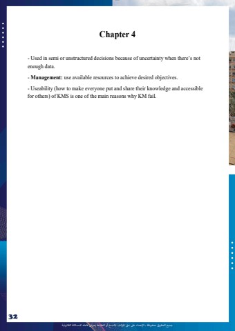 %u062c%u0645%u064a%u0639 %u0627%u0644%u062d%u0642%u0648%u0642 %u0645%u062d%u0641%u0648%u0638%u0629 %u0640 %u0627%u0625%u0644%u0639%u062a%u062f%u0627%u0621 %u0639%u0649%u0644 %u062d%u0642 %u0627%u0645%u0644%u0624%u0644%u0641 %u0628%u0627%u0644%u0646%u0633%u062e %u0623%u0648 %u0627%u0644%u0637%u0628%u0627%u0639%u0629 %u064a%u0639%u0631%u0636 %u0641%u0627%u0639%u0644%u0647 %u0644%u0644%u0645%u0633%u0627%u0626%u0644%u0629 %u0627%u0644%u0642%u0627%u0646%u0648%u0646%u064a%u062932lOMoAR cPSD|10120753Chapter 4- Used in semi or unstructured decisions because of uncertainty when there%u2019s notenough data.- Management: use available resources to achieve desired objectives.- Useability (how to make everyone put and share their knowledge and accessiblefor others) of KMS is one of the main reasons why KM fail.