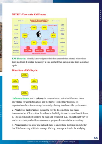 %u062c%u0645%u064a%u0639 %u0627%u0644%u062d%u0642%u0648%u0642 %u0645%u062d%u0641%u0648%u0638%u0629 %u0640 %u0627%u0625%u0644%u0639%u062a%u062f%u0627%u0621 %u0639%u0649%u0644 %u062d%u0642 %u0627%u0645%u0644%u0624%u0644%u0641 %u0628%u0627%u0644%u0646%u0633%u062e %u0623%u0648 %u0627%u0644%u0637%u0628%u0627%u0639%u0629 %u064a%u0639%u0631%u0636 %u0641%u0627%u0639%u0644%u0647 %u0644%u0644%u0645%u0633%u0627%u0626%u0644%u0629 %u0627%u0644%u0642%u0627%u0646%u0648%u0646%u064a%u062933lOMoAR cPSD|10120753MITRE%u2019s View to the KM ProcessKM life cycle: Identify knowledge needed then created then shared with othersthen modified if needed then apply it in a context then act on it and then identifiedagain.Other form of KMS cycle:Influence factors are 1- culture: in some cultures, make it difficult to shareknowledge for competitiveness and the fear of losing their position, so,organizations have to encourage knowledge sharing to enhance the performance.2- Practice or best practice: means the way to do something that needsdocumented so it%u2019ll save time for others to find it by themselves and benefit fromit. This documentation needs to be clear and organized. E.g., find efficient way tomarket a certain product for customers or prepare documents for accounting.3- Processes: have a clear and defined steps to understand the topic much betterthat%u2019ll influence my ability to manage KM. e.g., manage schedule for studying,