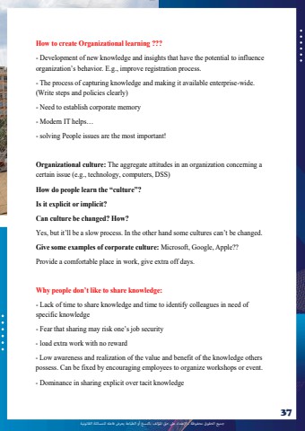 %u062c%u0645%u064a%u0639 %u0627%u0644%u062d%u0642%u0648%u0642 %u0645%u062d%u0641%u0648%u0638%u0629 %u0640 %u0627%u0625%u0644%u0639%u062a%u062f%u0627%u0621 %u0639%u0649%u0644 %u062d%u0642 %u0627%u0645%u0644%u0624%u0644%u0641 %u0628%u0627%u0644%u0646%u0633%u062e %u0623%u0648 %u0627%u0644%u0637%u0628%u0627%u0639%u0629 %u064a%u0639%u0631%u0636 %u0641%u0627%u0639%u0644%u0647 %u0644%u0644%u0645%u0633%u0627%u0626%u0644%u0629 %u0627%u0644%u0642%u0627%u0646%u0648%u0646%u064a%u062937lOMoAR cPSD|10120753How to create Organizational learning ???- Development of new knowledge and insights that have the potential to influenceorganization%u2019s behavior. E.g., improve registration process.- The process of capturing knowledge and making it available enterprise-wide.(Write steps and policies clearly)- Need to establish corporate memory- Modern IT helps%u2026- solving People issues are the most important!Organizational culture: The aggregate attitudes in an organization concerning acertain issue (e.g., technology, computers, DSS)How do people learn the %u201cculture%u201d?Is it explicit or implicit?Can culture be changed? How?Yes, but it%u2019ll be a slow process. In the other hand some cultures can%u2019t be changed.Give some examples of corporate culture: Microsoft, Google, Apple??Provide a comfortable place in work, give extra off days.Why people don%u2019t like to share knowledge:- Lack of time to share knowledge and time to identify colleagues in need ofspecific knowledge- Fear that sharing may risk one%u2019s job security- load extra work with no reward- Low awareness and realization of the value and benefit of the knowledge otherspossess. Can be fixed by encouraging employees to organize workshops or event.- Dominance in sharing explicit over tacit knowledge