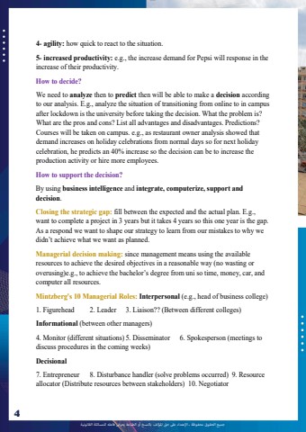 %u062c%u0645%u064a%u0639 %u0627%u0644%u062d%u0642%u0648%u0642 %u0645%u062d%u0641%u0648%u0638%u0629 %u0640 %u0627%u0625%u0644%u0639%u062a%u062f%u0627%u0621 %u0639%u0649%u0644 %u062d%u0642 %u0627%u0645%u0644%u0624%u0644%u0641 %u0628%u0627%u0644%u0646%u0633%u062e %u0623%u0648 %u0627%u0644%u0637%u0628%u0627%u0639%u0629 %u064a%u0639%u0631%u0636 %u0641%u0627%u0639%u0644%u0647 %u0644%u0644%u0645%u0633%u0627%u0626%u0644%u0629 %u0627%u0644%u0642%u0627%u0646%u0648%u0646%u064a%u06294lOMoAR cPSD|101207534- agility: how quick to react to the situation.5- increased productivity: e.g., the increase demand for Pepsi will response in theincrease of their productivity.How to decide?We need to analyze then to predict then will be able to make a decision accordingto our analysis. E.g., analyze the situation of transitioning from online to in campusafter lockdown is the university before taking the decision. What the problem is?What are the pros and cons? List all advantages and disadvantages. Predictions?Courses will be taken on campus. e.g., as restaurant owner analysis showed thatdemand increases on holiday celebrations from normal days so for next holidaycelebration, he predicts an 40% increase so the decision can be to increase theproduction activity or hire more employees.How to support the decision?By using business intelligence and integrate, computerize, support anddecision.Closing the strategic gap: fill between the expected and the actual plan. E.g.,want to complete a project in 3 years but it takes 4 years so this one year is the gap.As a respond we want to shape our strategy to learn from our mistakes to why wedidn%u2019t achieve what we want as planned.Managerial decision making: since management means using the availableresources to achieve the desired objectives in a reasonable way (no wasting oroverusing)e.g., to achieve the bachelor%u2019s degree from uni so time, money, car, andcomputer all resources.Mintzberg's 10 Managerial Roles: Interpersonal (e.g., head of business college)1. Figurehead 2. Leader 3. Liaison?? (Between different colleges)Informational (between other managers)4. Monitor (different situations) 5. Disseminator 6. Spokesperson (meetings todiscuss procedures in the coming weeks)Decisional7. Entrepreneur 8. Disturbance handler (solve problems occurred) 9. Resourceallocator (Distribute resources between stakeholders) 10. Negotiator