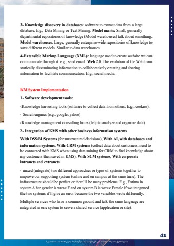 %u062c%u0645%u064a%u0639 %u0627%u0644%u062d%u0642%u0648%u0642 %u0645%u062d%u0641%u0648%u0638%u0629 %u0640 %u0627%u0625%u0644%u0639%u062a%u062f%u0627%u0621 %u0639%u0649%u0644 %u062d%u0642 %u0627%u0645%u0644%u0624%u0644%u0641 %u0628%u0627%u0644%u0646%u0633%u062e %u0623%u0648 %u0627%u0644%u0637%u0628%u0627%u0639%u0629 %u064a%u0639%u0631%u0636 %u0641%u0627%u0639%u0644%u0647 %u0644%u0644%u0645%u0633%u0627%u0626%u0644%u0629 %u0627%u0644%u0642%u0627%u0646%u0648%u0646%u064a%u062941lOMoAR cPSD|101207533- Knowledge discovery in databases: software to extract data from a largedatabase. E.g., Data Mining or Text Mining. Model marts: Small, generallydepartmental repositories of knowledge (Model warehouses) talk about something.Model warehouses: Large, generally enterprise-wide repositories of knowledge tosave different models. Similar to data warehouses.4-Extensible Markup Language (XML): language used to create website we cancommunicate through it. e.g., send email. Web 2.0: The evolution of the Web fromstatically disseminating information to collaboratively creating and sharinginformation to facilitate communication. E.g., social media.KM System Implementation1- Software development tools:-Knowledge harvesting tools (software to collect data from others. E.g., cookies).- Search engines (e.g., google, yahoo)-Knowledge management consulting firms (help to analyze and organize data)2- Integration of KMS with other business information systemsWith DSS/BI Systems (for unstructured decisions), With AI, with databases andinformation systems, With CRM systems (collect data about customers, need tobe connected with KMS when using data mining for CRM to find knowledge aboutmy customers then saved in KMS), With SCM systems, With corporateintranets and extranets.- mixed (integrate) two different approaches or types of systems together toimprove our supporting system (online and on campus at the same time). Theinfrastructure should be perfect or there%u2019ll be many problems. E.g., Fatima insystem A her gender is wrote F and on system B is wrote Female if we integratedthe two systems it%u2019ll give an error because the two variables wrote differently.Multiple services who have a common ground and talk the same language areintegrated in one system to serve a shared service (application or site).