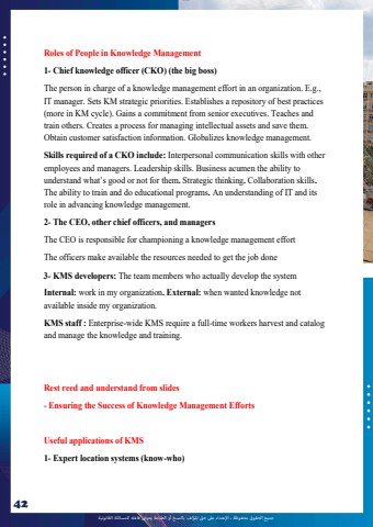 %u062c%u0645%u064a%u0639 %u0627%u0644%u062d%u0642%u0648%u0642 %u0645%u062d%u0641%u0648%u0638%u0629 %u0640 %u0627%u0625%u0644%u0639%u062a%u062f%u0627%u0621 %u0639%u0649%u0644 %u062d%u0642 %u0627%u0645%u0644%u0624%u0644%u0641 %u0628%u0627%u0644%u0646%u0633%u062e %u0623%u0648 %u0627%u0644%u0637%u0628%u0627%u0639%u0629 %u064a%u0639%u0631%u0636 %u0641%u0627%u0639%u0644%u0647 %u0644%u0644%u0645%u0633%u0627%u0626%u0644%u0629 %u0627%u0644%u0642%u0627%u0646%u0648%u0646%u064a%u062942lOMoAR cPSD|10120753Roles of People in Knowledge Management1- Chief knowledge officer (CKO) (the big boss)The person in charge of a knowledge management effort in an organization. E.g.,IT manager. Sets KM strategic priorities. Establishes a repository of best practices(more in KM cycle). Gains a commitment from senior executives. Teaches andtrain others. Creates a process for managing intellectual assets and save them.Obtain customer satisfaction information. Globalizes knowledge management.Skills required of a CKO include: Interpersonal communication skills with otheremployees and managers. Leadership skills. Business acumen the ability tounderstand what%u2019s good or not for them. Strategic thinking. Collaboration skills.The ability to train and do educational programs. An understanding of IT and itsrole in advancing knowledge management.2- The CEO, other chief officers, and managersThe CEO is responsible for championing a knowledge management effortThe officers make available the resources needed to get the job done3- KMS developers: The team members who actually develop the systemInternal: work in my organization. External: when wanted knowledge notavailable inside my organization.KMS staff : Enterprise-wide KMS require a full-time workers harvest and catalogand manage the knowledge and training.Rest reed and understand from slides- Ensuring the Success of Knowledge Management EffortsUseful applications of KMS1- Expert location systems (know-who)