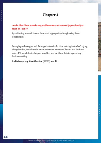 %u062c%u0645%u064a%u0639 %u0627%u0644%u062d%u0642%u0648%u0642 %u0645%u062d%u0641%u0648%u0638%u0629 %u0640 %u0627%u0625%u0644%u0639%u062a%u062f%u0627%u0621 %u0639%u0649%u0644 %u062d%u0642 %u0627%u0645%u0644%u0624%u0644%u0641 %u0628%u0627%u0644%u0646%u0633%u062e %u0623%u0648 %u0627%u0644%u0637%u0628%u0627%u0639%u0629 %u064a%u0639%u0631%u0636 %u0641%u0627%u0639%u0644%u0647 %u0644%u0644%u0645%u0633%u0627%u0626%u0644%u0629 %u0627%u0644%u0642%u0627%u0646%u0648%u0646%u064a%u062944lOMoAR cPSD|10120753Chapter 4- main Idea: How to make my problems more structured (operational) asmuch as I can??By collecting as much data as I can with high quality through using thesetechnologies.Emerging technologies and their application in decision making instead of relyingof regular data, social media has an enormous amount of data so as a decisionmaker I%u2019ll search for techniques to collect and use these data to support mydecision making.Radio frequency identification (RFID) and BI: