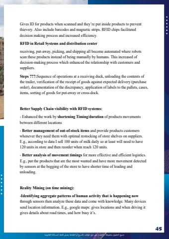 %u062c%u0645%u064a%u0639 %u0627%u0644%u062d%u0642%u0648%u0642 %u0645%u062d%u0641%u0648%u0638%u0629 %u0640 %u0627%u0625%u0644%u0639%u062a%u062f%u0627%u0621 %u0639%u0649%u0644 %u062d%u0642 %u0627%u0645%u0644%u0624%u0644%u0641 %u0628%u0627%u0644%u0646%u0633%u062e %u0623%u0648 %u0627%u0644%u0637%u0628%u0627%u0639%u0629 %u064a%u0639%u0631%u0636 %u0641%u0627%u0639%u0644%u0647 %u0644%u0644%u0645%u0633%u0627%u0626%u0644%u0629 %u0627%u0644%u0642%u0627%u0646%u0648%u0646%u064a%u062945lOMoAR cPSD|10120753Gives ID for products when scanned and they%u2019re put inside products to preventthievery. Also include barcodes and magnetic strips. RFID chips facilitateddecision making process and increased efficiency.RFID in Retail Systems and distribution centerreceiving, put-away, picking, and shipping all become automated where robotsscan these products instead of being manually by humans. This increased ofdecision-making process which enhanced the relationship with customers andsuppliers.Steps ???:Sequence of operations at a receiving duck, unloading the contents ofthe trailer, verification of the receipt of goods against expected delivery (purchaseorder), documentation of the discrepancy, application of labels to the pallets, cases,items, sorting of goods for put-away or cross-dock.Better Supply Chain visibility with RFID systems:- Enhanced the work by shortening Timing/duration of products movementsbetween different locations- Better management of out-of-stock items and provide products customerswhenever they need them with optimal restocking of store shelves on suppliers.E.g., according to data I sell 100 units of milk daily so at least will need to have120 units in store and then reorder when reach 120 units.- Better analysis of movement timings for more effective and efficient logistics.E.g., put the products that are the most wanted and have more movement detectedby sensors at the begging of the store to have shorter time of loading andunloading.Reality Mining (on time mining):-Identifying aggregate patterns of human activity that is happening nowthrough sensors then analyze these data and come with knowledge. Many devicessend location information. E.g., google maps: gives locations and when driving itgives details about road times, and how busy it%u2019s.