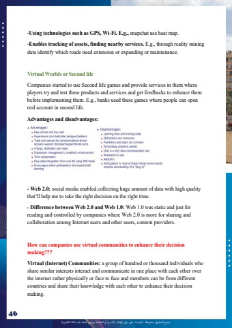 %u062c%u0645%u064a%u0639 %u0627%u0644%u062d%u0642%u0648%u0642 %u0645%u062d%u0641%u0648%u0638%u0629 %u0640 %u0627%u0625%u0644%u0639%u062a%u062f%u0627%u0621 %u0639%u0649%u0644 %u062d%u0642 %u0627%u0645%u0644%u0624%u0644%u0641 %u0628%u0627%u0644%u0646%u0633%u062e %u0623%u0648 %u0627%u0644%u0637%u0628%u0627%u0639%u0629 %u064a%u0639%u0631%u0636 %u0641%u0627%u0639%u0644%u0647 %u0644%u0644%u0645%u0633%u0627%u0626%u0644%u0629 %u0627%u0644%u0642%u0627%u0646%u0648%u0646%u064a%u062946lOMoAR cPSD|10120753-Using technologies such as GPS, Wi-Fi. E.g., snapchat use heat map.-Enables tracking of assets, finding nearby services. E.g., through reality miningdata identify which roads need extension or expanding or maintenance.Virtual Worlds or Second lifeCompanies started to use Second life games and provide services in them whereplayers try and test these products and services and get feedbacks to enhance thembefore implementing them. E.g., banks used these games where people can openreal account in second life.Advantages and disadvantages:- Web 2.0: social media enabled collecting huge amount of data with high qualitythat%u2019ll help me to take the right decision on the right time.- Difference between Web 2.0 and Web 1.0: Web 1.0 was static and just forreading and controlled by companies where Web 2.0 is more for sharing andcollaboration among Internet users and other users, content providers.How can companies use virtual communities to enhance their decisionmaking???Virtual (Internet) Communities: a group of hundred or thousand individuals whoshare similar interests interact and communicate in one place with each other overthe internet rather physically or face to face and members can be from differentcountries and share their knowledge with each other to enhance their decisionmaking.