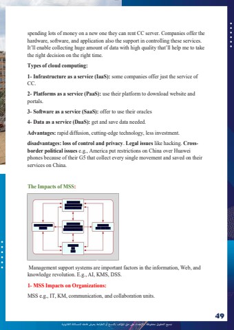 %u062c%u0645%u064a%u0639 %u0627%u0644%u062d%u0642%u0648%u0642 %u0645%u062d%u0641%u0648%u0638%u0629 %u0640 %u0627%u0625%u0644%u0639%u062a%u062f%u0627%u0621 %u0639%u0649%u0644 %u062d%u0642 %u0627%u0645%u0644%u0624%u0644%u0641 %u0628%u0627%u0644%u0646%u0633%u062e %u0623%u0648 %u0627%u0644%u0637%u0628%u0627%u0639%u0629 %u064a%u0639%u0631%u0636 %u0641%u0627%u0639%u0644%u0647 %u0644%u0644%u0645%u0633%u0627%u0626%u0644%u0629 %u0627%u0644%u0642%u0627%u0646%u0648%u0646%u064a%u062949lOMoAR cPSD|10120753spending lots of money on a new one they can rent CC server. Companies offer thehardware, software, and application also the support in controlling these services.It%u2019ll enable collecting huge amount of data with high quality that%u2019ll help me to takethe right decision on the right time.Types of cloud computing:1- Infrastructure as a service (IaaS): some companies offer just the service ofCC.2- Platforms as a service (PaaS): use their platform to download website andportals.3- Software as a service (SaaS): offer to use their oracles4- Data as a service (DaaS): get and save data needed.Advantages: rapid diffusion, cutting-edge technology, less investment.disadvantages: loss of control and privacy. Legal issues like hacking. Crossborder political issues e.g., America put restrictions on China over Huaweiphones because of their G5 that collect every single movement and saved on theirservices on China.The Impacts of MSS:Management support systems are important factors in the information, Web, andknowledge revolution. E.g., AI, KMS, DSS.1- MSS Impacts on Organizations:MSS e.g., IT, KM, communication, and collaboration units.
