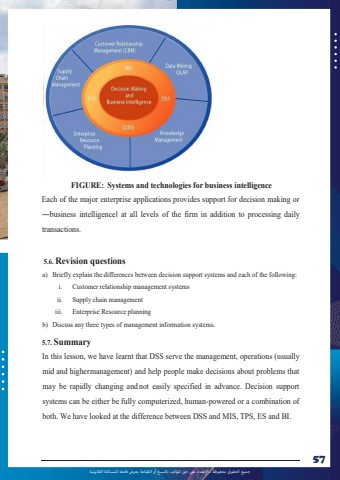 %u062c%u0645%u064a%u0639 %u0627%u0644%u062d%u0642%u0648%u0642 %u0645%u062d%u0641%u0648%u0638%u0629 %u0640 %u0627%u0625%u0644%u0639%u062a%u062f%u0627%u0621 %u0639%u0649%u0644 %u062d%u0642 %u0627%u0645%u0644%u0624%u0644%u0641 %u0628%u0627%u0644%u0646%u0633%u062e %u0623%u0648 %u0627%u0644%u0637%u0628%u0627%u0639%u0629 %u064a%u0639%u0631%u0636 %u0641%u0627%u0639%u0644%u0647 %u0644%u0644%u0645%u0633%u0627%u0626%u0644%u0629 %u0627%u0644%u0642%u0627%u0646%u0648%u0646%u064a%u062957lOMoAR cPSD|10120753FIGURE: Systems and technologies for business intelligenceEach of the major enterprise applications provides support for decision making or %u2015business intelligence%u2016 at all levels of the firm in addition to processing dailytransactions.5.6. Revision questionsa) Briefly explain the differences between decision support systems and each of the following:i. Customer relationship management systemsii. Supply chain managementiii. Enterprise Resource planningb) Discuss any three types of management information systems.5.7. SummaryIn this lesson, we have learnt that DSS serve the management, operations (usuallymid and highermanagement) and help people make decisions about problems that may be rapidly changing and not easily specified in advance. Decision support systems can be either be fully computerized, human-powered or a combination of both. We have looked at the difference between DSS and MIS, TPS, ES and BI.