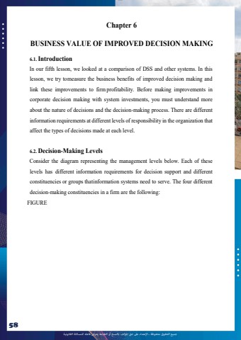 %u062c%u0645%u064a%u0639 %u0627%u0644%u062d%u0642%u0648%u0642 %u0645%u062d%u0641%u0648%u0638%u0629 %u0640 %u0627%u0625%u0644%u0639%u062a%u062f%u0627%u0621 %u0639%u0649%u0644 %u062d%u0642 %u0627%u0645%u0644%u0624%u0644%u0641 %u0628%u0627%u0644%u0646%u0633%u062e %u0623%u0648 %u0627%u0644%u0637%u0628%u0627%u0639%u0629 %u064a%u0639%u0631%u0636 %u0641%u0627%u0639%u0644%u0647 %u0644%u0644%u0645%u0633%u0627%u0626%u0644%u0629 %u0627%u0644%u0642%u0627%u0646%u0648%u0646%u064a%u062958lOMoAR cPSD|10120753Chapter 6BUSINESS VALUE OF IMPROVED DECISION MAKING6.1. IntroductionIn our fifth lesson, we looked at a comparison of DSS and other systems. In thislesson, we try tomeasure the business benefits of improved decision making and link these improvements to firm profitability. Before making improvements incorporate decision making with system investments, you must understand more about the nature of decisions and the decision-making process. There are different information requirements at different levels of responsibility in the organization that affect the types of decisions made at each level.6.2. Decision-Making LevelsConsider the diagram representing the management levels below. Each of these levels has different information requirements for decision support and differentconstituencies or groups thatinformation systems need to serve. The four different decision-making constituencies in a firm are the following:FIGURE