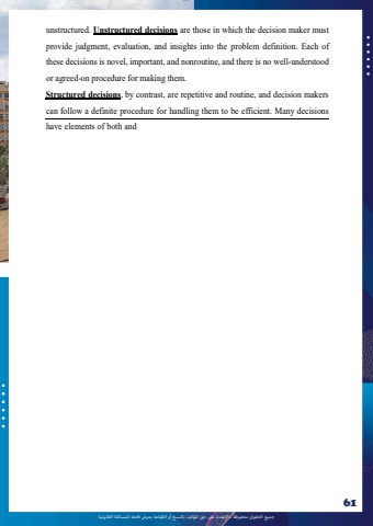 %u062c%u0645%u064a%u0639 %u0627%u0644%u062d%u0642%u0648%u0642 %u0645%u062d%u0641%u0648%u0638%u0629 %u0640 %u0627%u0625%u0644%u0639%u062a%u062f%u0627%u0621 %u0639%u0649%u0644 %u062d%u0642 %u0627%u0645%u0644%u0624%u0644%u0641 %u0628%u0627%u0644%u0646%u0633%u062e %u0623%u0648 %u0627%u0644%u0637%u0628%u0627%u0639%u0629 %u064a%u0639%u0631%u0636 %u0641%u0627%u0639%u0644%u0647 %u0644%u0644%u0645%u0633%u0627%u0626%u0644%u0629 %u0627%u0644%u0642%u0627%u0646%u0648%u0646%u064a%u062961lOMoAR cPSD|10120753unstructured. Unstructured decisions are those in which the decision maker must provide judgment, evaluation, and insights into the problem definition. Each of these decisions is novel, important, and nonroutine, and there is no well-understoodor agreed-on procedure for making them.Structured decisions, by contrast, are repetitive and routine, and decision makers can follow a definite procedure for handling them to be efficient. Many decisionshave elements of both and