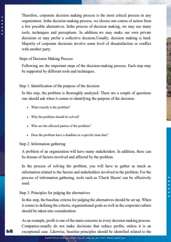 %u062c%u0645%u064a%u0639 %u0627%u0644%u062d%u0642%u0648%u0642 %u0645%u062d%u0641%u0648%u0638%u0629 %u0640 %u0627%u0625%u0644%u0639%u062a%u062f%u0627%u0621 %u0639%u0649%u0644 %u062d%u0642 %u0627%u0645%u0644%u0624%u0644%u0641 %u0628%u0627%u0644%u0646%u0633%u062e %u0623%u0648 %u0627%u0644%u0637%u0628%u0627%u0639%u0629 %u064a%u0639%u0631%u0636 %u0641%u0627%u0639%u0644%u0647 %u0644%u0644%u0645%u0633%u0627%u0626%u0644%u0629 %u0627%u0644%u0642%u0627%u0646%u0648%u0646%u064a%u062968lOMoAR cPSD|10120753Therefore, corporate decision making process is the most critical process in any organization. Inthe decision-making process, we choose one course of action froma few possible alternatives. Inthe process of decision making, we may use manytools, techniques and perceptions. In addition, we may make our own private decisions or may prefer a collective decision.Usually, decision making is hard. Majority of corporate decisions involve some level of dissatisfaction or conflictwith another party.Steps of Decision Making ProcessFollowing are the important steps of the decision-making process. Each step may be supported by different tools and techniques.Step 1: Identification of the purpose of the decisionIn this step, the problem is thoroughly analyzed. There are a couple of questions one should ask when it comes to identifying the purpose of the decision.%uf0b7 What exactly is the problem?%uf0b7 Why the problem should be solved?%uf0b7 Who are the affected parties of the problem?%uf0b7 Does the problem have a deadline or a specific time-line?Step 2: Information gatheringA problem of an organization will have many stakeholders. In addition, there can be dozens of factors involved and affected by the problem.In the process of solving the problem, you will have to gather as much as information related to the factors and stakeholders involved in the problem. For the process of information gathering, tools such as 'Check Sheets' can be effectivelyused.Step 3: Principles for judging the alternativesIn this step, the baseline criteria for judging the alternatives should be set up. When it comes to defining the criteria, organizational goals as well as the corporate culture should be taken into consideration.As an example, profit is one of the main concerns in every decision making process. Companies usually do not make decisions that reduce profits, unless it is an exceptional case. Likewise, baseline principles should be identified related to the