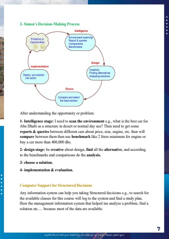 %u062c%u0645%u064a%u0639 %u0627%u0644%u062d%u0642%u0648%u0642 %u0645%u062d%u0641%u0648%u0638%u0629 %u0640 %u0627%u0625%u0644%u0639%u062a%u062f%u0627%u0621 %u0639%u0649%u0644 %u062d%u0642 %u0627%u0645%u0644%u0624%u0644%u0641 %u0628%u0627%u0644%u0646%u0633%u062e %u0623%u0648 %u0627%u0644%u0637%u0628%u0627%u0639%u0629 %u064a%u0639%u0631%u0636 %u0641%u0627%u0639%u0644%u0647 %u0644%u0644%u0645%u0633%u0627%u0626%u0644%u0629 %u0627%u0644%u0642%u0627%u0646%u0648%u0646%u064a%u06297lOMoAR cPSD|101207532- Simon%u2019s Decision-Making ProcessAfter understanding the opportunity or problem:1- Intelligence stage: I need to scan the environment e.g., what is the best car forAbu Dhabi as a structure in desert or normal day use? Then need to get somereports & queries between different cars about price, size, engine, etc. then willcompare between them then use benchmark like 2 liters minimum for engine orbuy a car more than 400,000 dhs.2- design stage: be creative about design, find all the alternative, and accordingto the benchmarks and comparisons do the analysis.3- choose a solution.4- implementation & evaluation.Computer Support for Structured DecisionsAny information system can help you taking Structured decisions e.g., to search forthe available classes for this course will log to the system and find a study plan.Here the management information system that helped me analyze a problem, find asolution etc.%u2026 because most of the data are available.