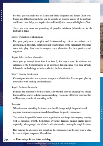 %u062c%u0645%u064a%u0639 %u0627%u0644%u062d%u0642%u0648%u0642 %u0645%u062d%u0641%u0648%u0638%u0629 %u0640 %u0627%u0625%u0644%u0639%u062a%u062f%u0627%u0621 %u0639%u0649%u0644 %u062d%u0642 %u0627%u0645%u0644%u0624%u0644%u0641 %u0628%u0627%u0644%u0646%u0633%u062e %u0623%u0648 %u0627%u0644%u0637%u0628%u0627%u0639%u0629 %u064a%u0639%u0631%u0636 %u0641%u0627%u0639%u0644%u0647 %u0644%u0644%u0645%u0633%u0627%u0626%u0644%u0629 %u0627%u0644%u0642%u0627%u0646%u0648%u0646%u064a%u062970lOMoAR cPSD|10120753For this, you can make use of Cause-and-Effect diagrams and Pareto Chart tool.Cause-and-Effectdiagram helps you to identify all possible causes of the problem and Pareto chart helps you to prioritize and identify the causes with highest effect.Then, you can move on generating all possible solutions (alternatives) for theproblem in hand.Step 5: Evaluation of alternativesUse your judgement principles and decision-making criteria to evaluate each alternative. In this step, experience and effectiveness of the judgement principles come into play. You need to compare each alternative for their positives and negatives.Step 6: Select the best alternativeOnce you go through from Step 1 to Step 5, this step is easy. In addition, theselection of the best alternative is an informed decision since you have alreadyfollowed a methodology to derive andselect the best alternative.Step 7: Execute the decisionConvert your decision into a plan or a sequence of activities. Execute your plan by yourself or with the help of subordinates.Step 8: Evaluate the resultsEvaluate the outcome of your decision. See whether there is anything you should learn and then correct in future decision making. Thisis one of the best practicesthatwill improve your decision-making skills.RemarksWhen it comes to making decisions, one should always weigh the positive andnegative businessconsequences and should favor the positive outcomes.This avoids the possible losses to the organization and keeps the company running with a sustained growth. Sometimes, avoiding decision making seems easier; especially, when you get into a lot of confrontation after making the tough decision.But, making the decisions and accepting its consequences is the only way to stayin control ofyour corporate life and time.7.3. Four-steps in decision making